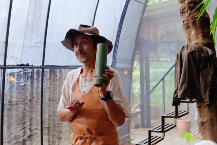活動一開始,長野先生帶領大家手工製作竹筷,教學前他先自我介紹:「我從小住在北海道,因為家裡經營山菜餐廳的關係,所以常會去附近的山林採集野菜,而家人們和我也很喜歡動手做一些生活用的小道具。今天一整天,我將和大家分享我的手作、野炊餐點和我自己蓋住家的故事。」