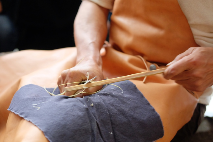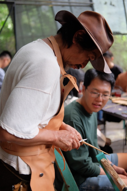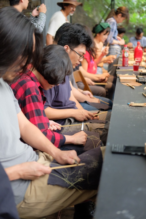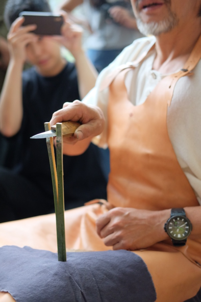 接著就進入手作課程了,長野先生帶著大家,先將竹片削成所需長度,大家都非常地聚精會神。然後要進入比較難的部分了,於是長野先生要大家圍到他跟前,他示範利用刀子末端頂在竹片的最上方,輕輕的捶一下,再用刀子轉一轉,就聽到竹片「啪啪」的聲音,瞬間裂成了兩半,這麼俐落的身手,大家都不禁發出驚嘆聲!
