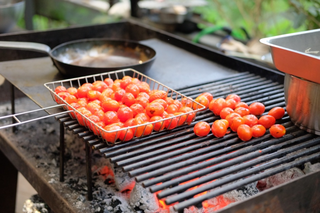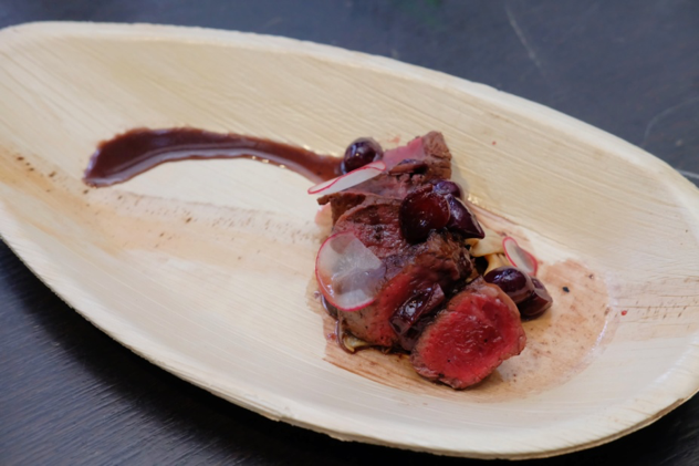 牛腰內肉是一種口感柔軟、無腥味的肉,配上台灣當季的葡萄,加上砂糖、紅酒、巴薩米可醋去烹煮,可以品嘗到葡萄的甜、酸、澀味,牛肉搭配上葡萄的多汁果肉,在嘴裡形成了豐富的風味。長野先生說,他在秋天露營的時候,就會去摘葡萄或水果,把他們做成搭配料理的醬汁,是他的樂趣之一。