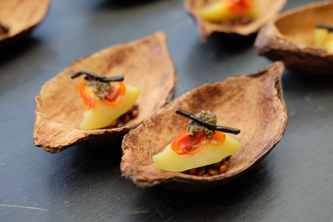 今天的第一道餐點為「漬山蔬」,Wes使用原住民常用的一種食材叫「木鱉果」(黃色果肉)用雞湯燉煮,吃起來甘苦,口感近似苦瓜。下面使用了樹豆,上面放了長野先生用新鮮野菜葉、橄欖油、核桃等打成的類青醬,黑色的棒狀物則是春天生長的蜂斗菜作成的「伽羅煮」(「きゃらぶき」是日本一種常備菜的作法,會使用醬油與砂糖將食材煮到像伽羅木的顏色)。