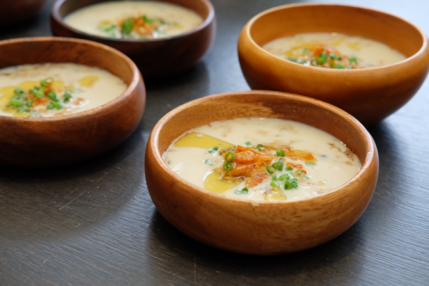 由 Wes 團隊發想的一道湯品,運用鹹豆漿的概念,一般鹹豆漿的凝固都是用醋,他則是將醃好的高麗菜煮開來的酸汁取代醋,再加上菜脯和炒過的新鮮櫻花蝦,帶有豐富的鹹香,最後用花蓮的小米椒帶上一點刺激的辣味。豆漿是來自池上的「豆芳華」,黃豆是店家自己栽種的,這道湯品有一種熟悉卻又新穎的滋味。