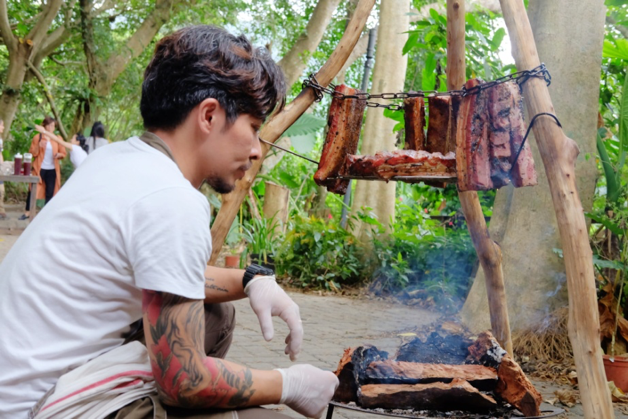 ▲ 活動還沒開始前,在少少研究室的外頭,Wes在看顧著煙燻培根。