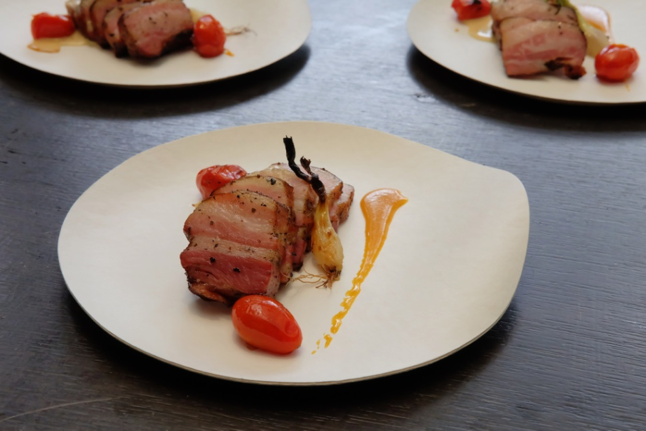 長野先生表示他每次露營一定會出這道菜,因為是他心目中的第一名料理,而且家裡還有專門儲藏煙燻培根的冰箱。使用鹽、糖、香草、辣椒、胡椒醃漬四天,平常會把醃好的肉放在20度以下的環境熟成,但這次因為時間關係,沒辦法一直去看顧它,所以改放冰箱熟成。接著用火堆煙燻肉,通常需要半天到三天的時間,看肉的狀況,這次則是和Wes輪流花了半天的時間去做這件事。培根肉有著濃郁的煙燻風味,鹹香多汁,搭配上使用北海道友人種植的山芥末野菜做的醬汁,更突顯肉的清甜。
