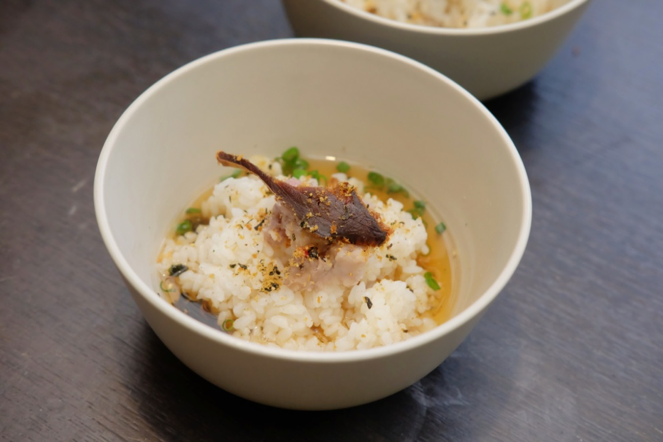 來自日本的「茶泡飯」,顧名思義就是在飯裡頭倒上一點茶,長野先生解釋道。碗裡最上方的是鯖魚乾,是他的友人用米糠醃漬14年的魚乾,非常的驚人!通常醃漬三年,米糠就會和食材融合在一起。而這種魚類的保存食方法,在日本已超過了百年的歷史,所以醃漬越久的食物,價值就越高。非常感謝長野先生的割愛啊!