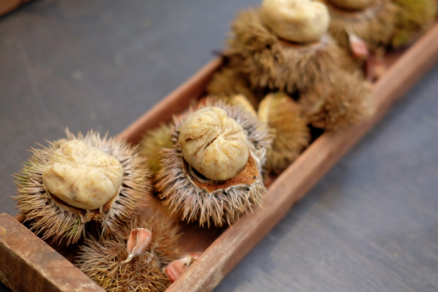 「栗茶巾絞」通常是把栗子搗碎加一些砂糖,今天則是加了鮮奶油,可以讓人好好品嘗栗子的香甜,這是秋天的味道。為什麼叫栗茶巾絞?茶道中,人們跪坐在地上,在喝茶之前,以前人會拿一種白色的棉質紗布擦茶碗,但現在已經不擦了,演變成一種動作。這道甜點把栗子和其他材料,放進茶巾裡頭,把布捏起來扭轉而成,所以有茶道的文化精神在裡頭。而這道料理還搭配上了三玉號用大花咸豐草、仙草、黃花蜜菜、紅骨蛇製作而成的野草茶,除了解膩,還可以幫助身體做平衡。