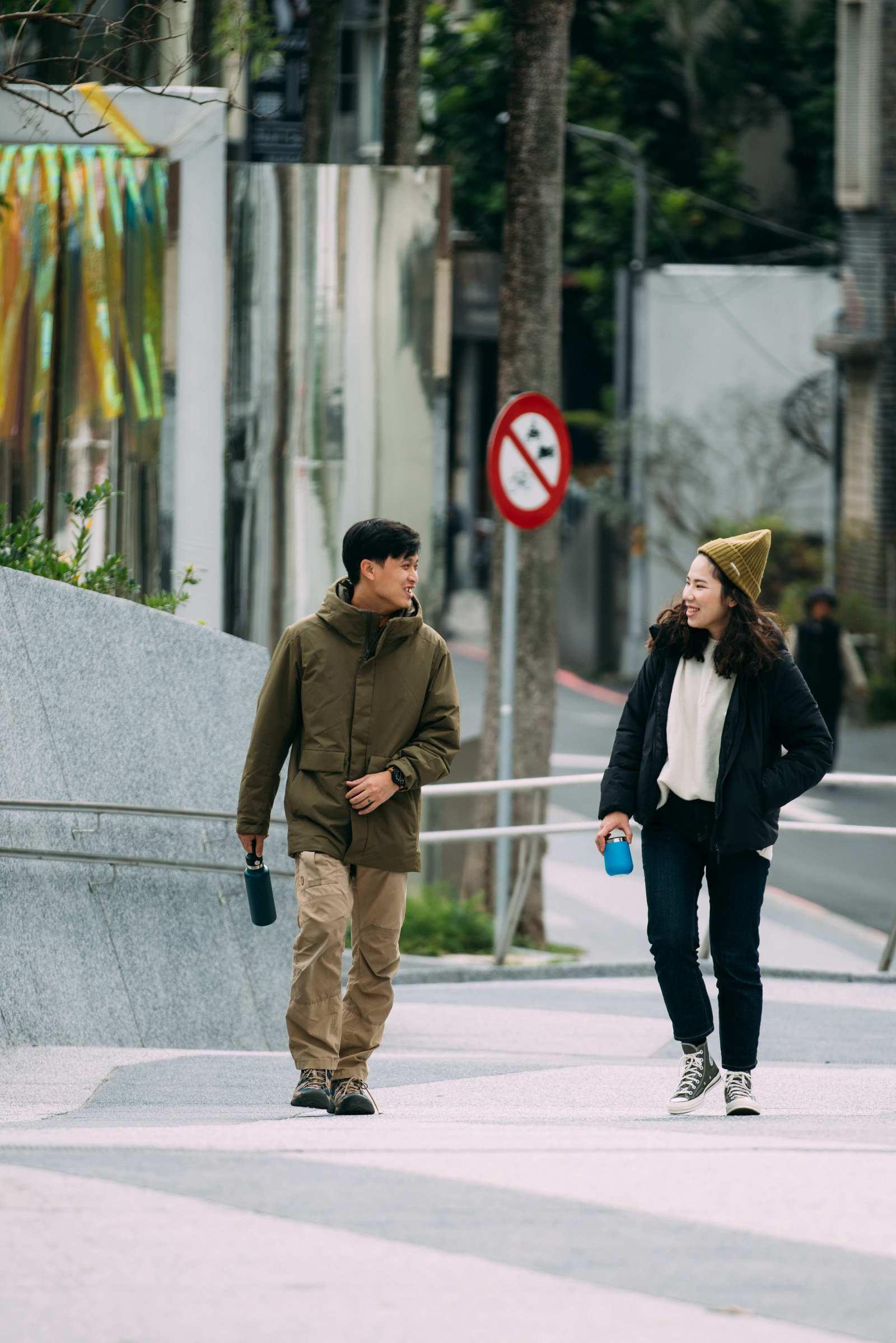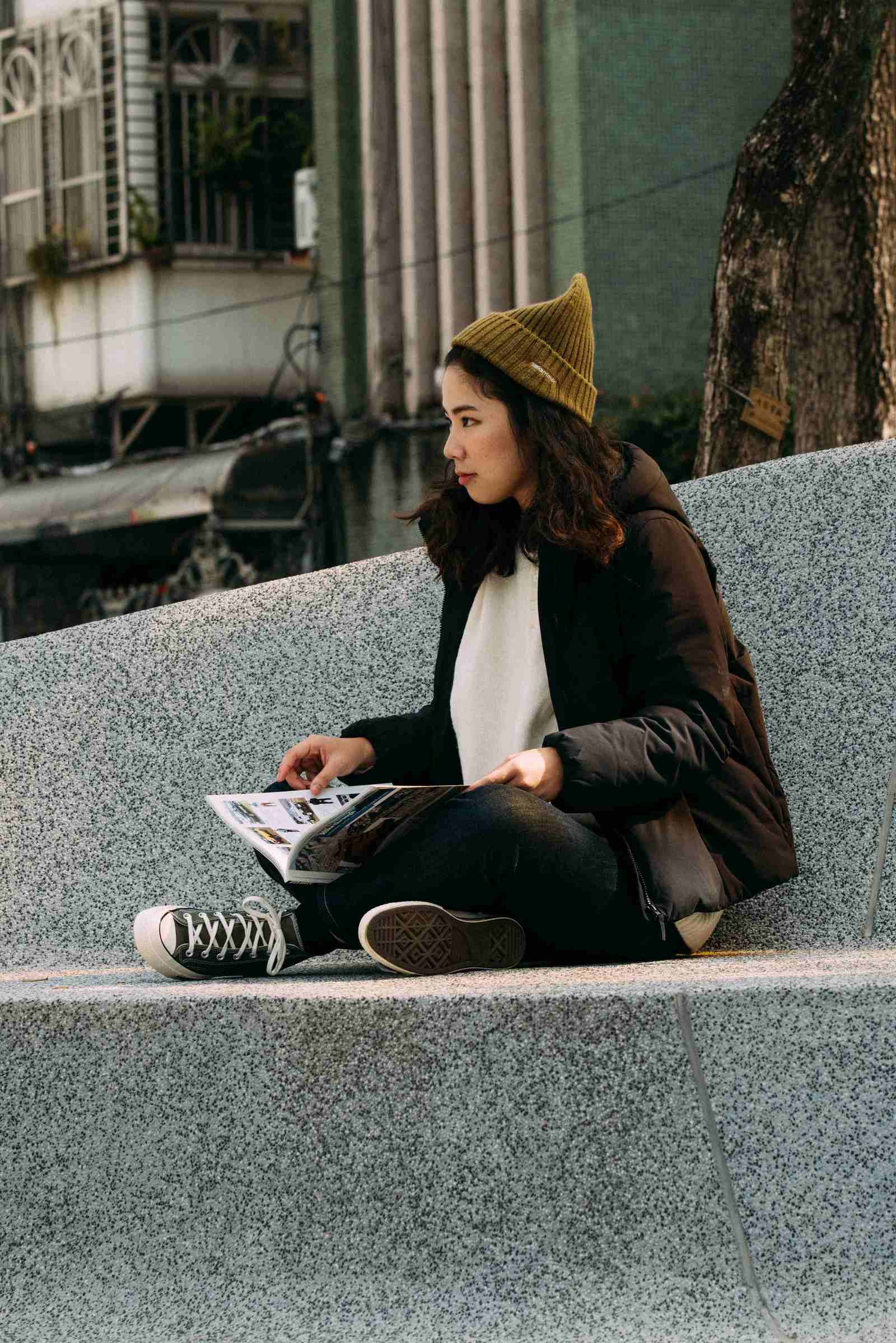 拍攝日同事 Claire 以戴綠帽的概念配上白毛衣與寬版牛仔褲型,在台北市街頭呈現濃濃的日本戶外感。