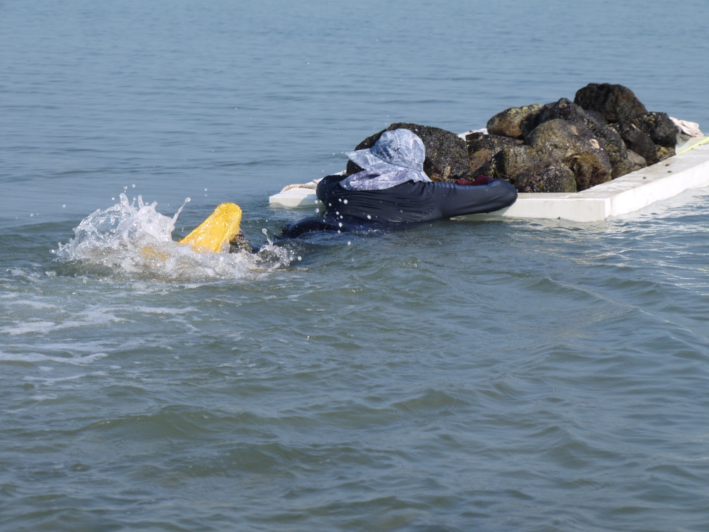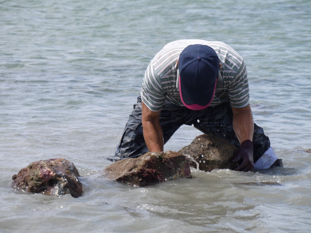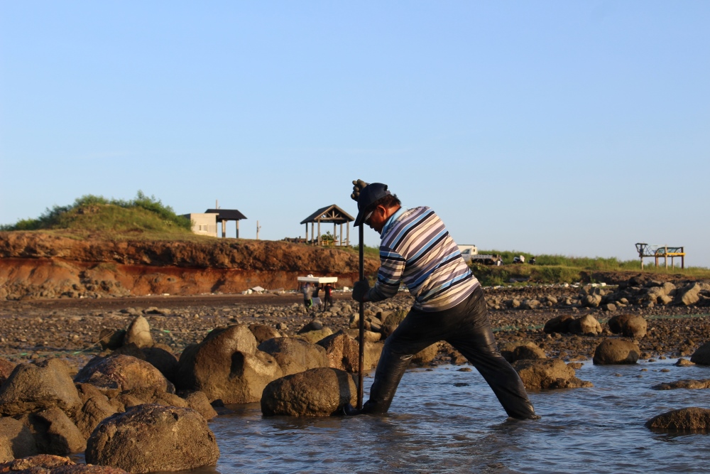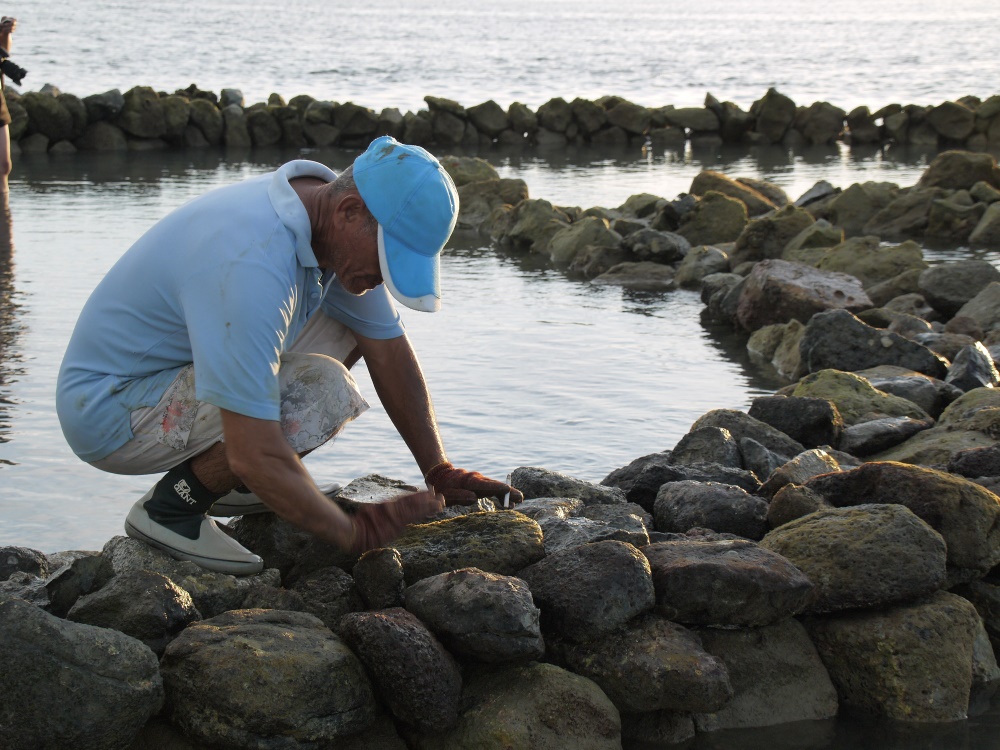 而石滬建好後,更不是放著捕魚就好,還需要定期修護。洪振坤解釋:「石滬裡面會淤積啊,所以要定期清淤。有一次我進去清淤,走進去時水只到我的腳踝,結果清掉一些石頭後,浪進來把淤泥捲走,我瞬間被滅頂。不過沒怎樣啦!游上去滬堤就好了。」