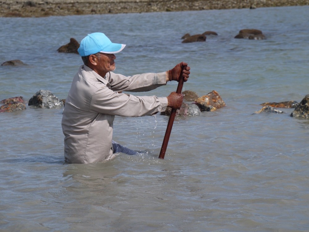 利用兩齒釘耙,插入長期沉積淤沙的石滬底部,將石滬崩塌或被掩埋的舊有基底石頭清理出來,將其翻動,再喬成適合疊砌的角度。
