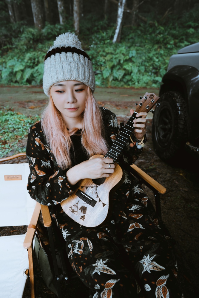 在幽靜的營地,獨具風格的 Jimny 越野車旁,坐著的是手中拿著一把烏克麗麗的「麗麗」。不知道是不是太喜歡烏克麗麗了,她的小名也與樂器同名。她笑說:「我真的離不開烏克麗麗欸!露營也是,我的生活就是露營跟烏克麗麗。」