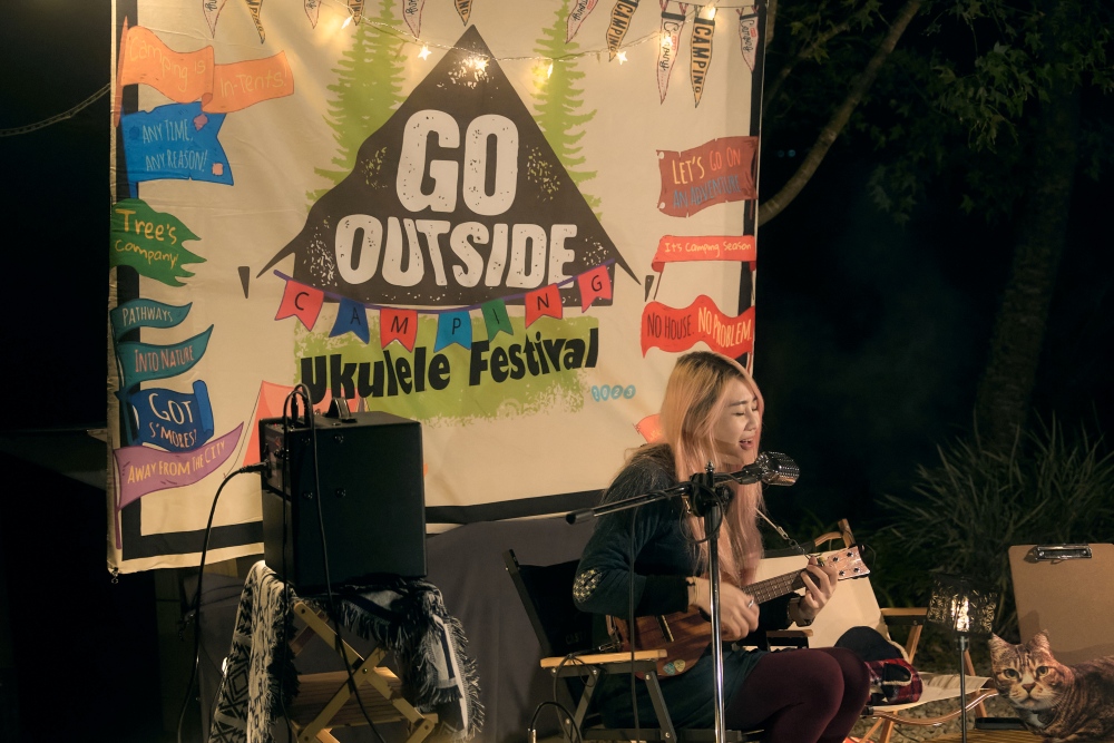 去野營時,她會先整理好營地、裝備,然後看心情有時會彈一下烏克麗麗,有時可能整趟旅程都沒拿出來彈奏。但由於身邊車友們都知道她會彈烏克麗麗,有時會問她願不願意表演一下。她笑說:「其實人很多的情況下,我真的不會主動把烏克麗麗拿出來彈。不過有一次在大家面前表演,讓我感覺滿好的。那次是大型的車聚,差不多有 30 幾台車,包下整個露營區。茶餘飯後,車友們拱我彈唱。我看大家很熱情,我也就把烏克麗麗拿出來彈。由於大家年齡相近,剛好我挑的歌大家都會唱。在我彈唱的同時,大家也很捧場地跟著唱,整個氣氛很開心。我甚至還因為這樣跟不熟的車友變成朋友。」