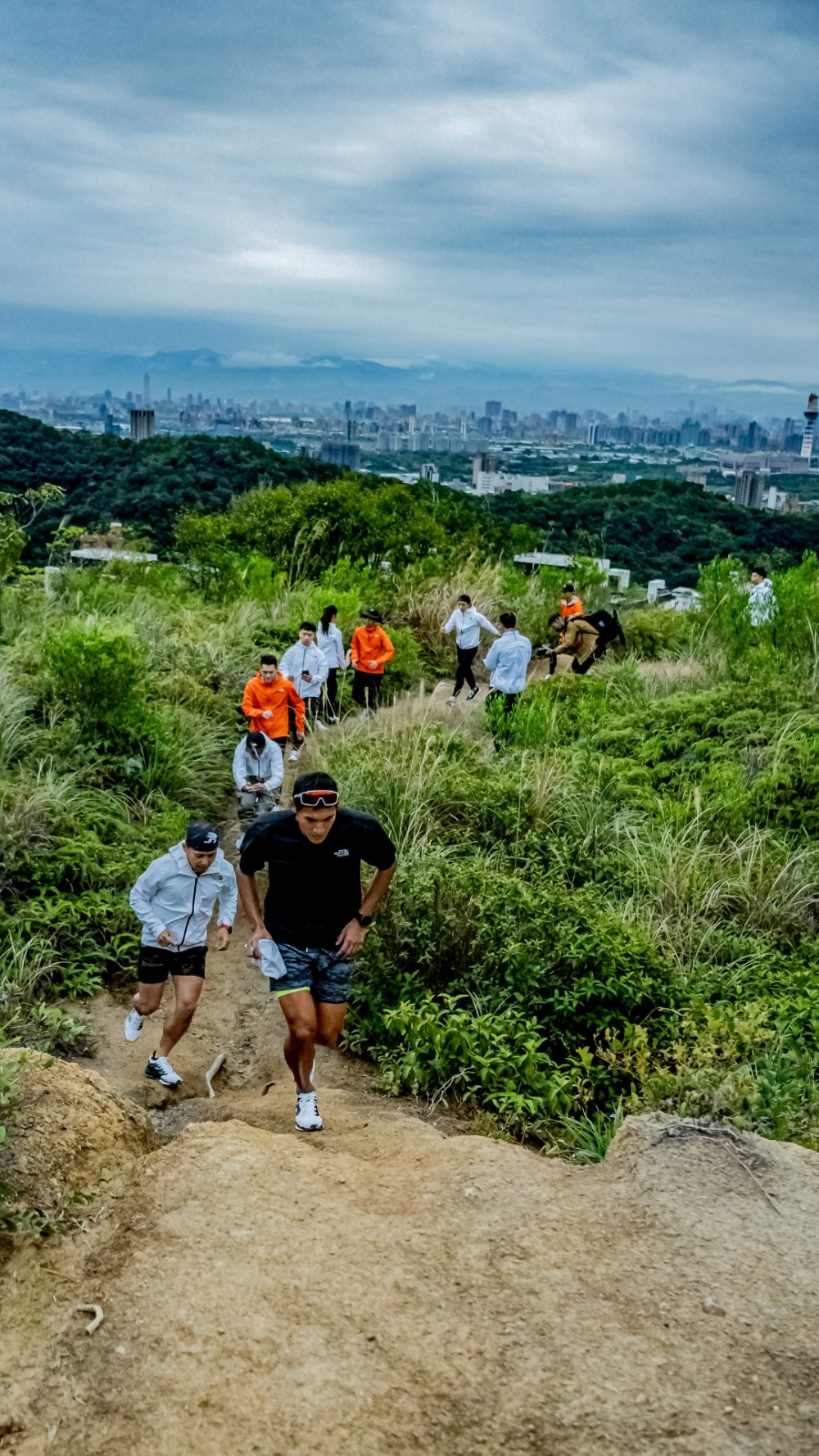 結束室內的活動後,我們驅車前往附近的丹鳳山步道準備進行令人期待的野跑測試。雖然這邊海拔不到 200 公尺,但地貌豐富加上難度不高,不僅是越野跑、越野單車人士的遊樂場,更是江晏慶最喜歡也是最推薦給新手的訓練場所之一。在開跑之前由江晏慶帶領大家先進行一系列充足的暖身運動,由於越野跑不像一般跑步是在平穩的路面上進行,所牽扯到的肌群相當多,所以他告訴大家一定要確實做好身體的延展才不會受傷。