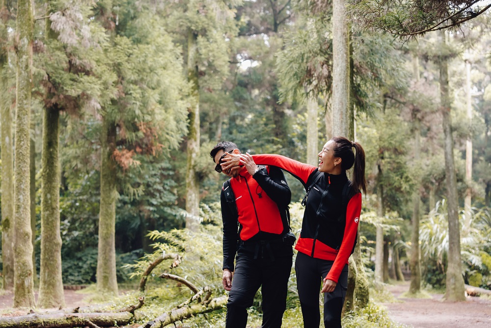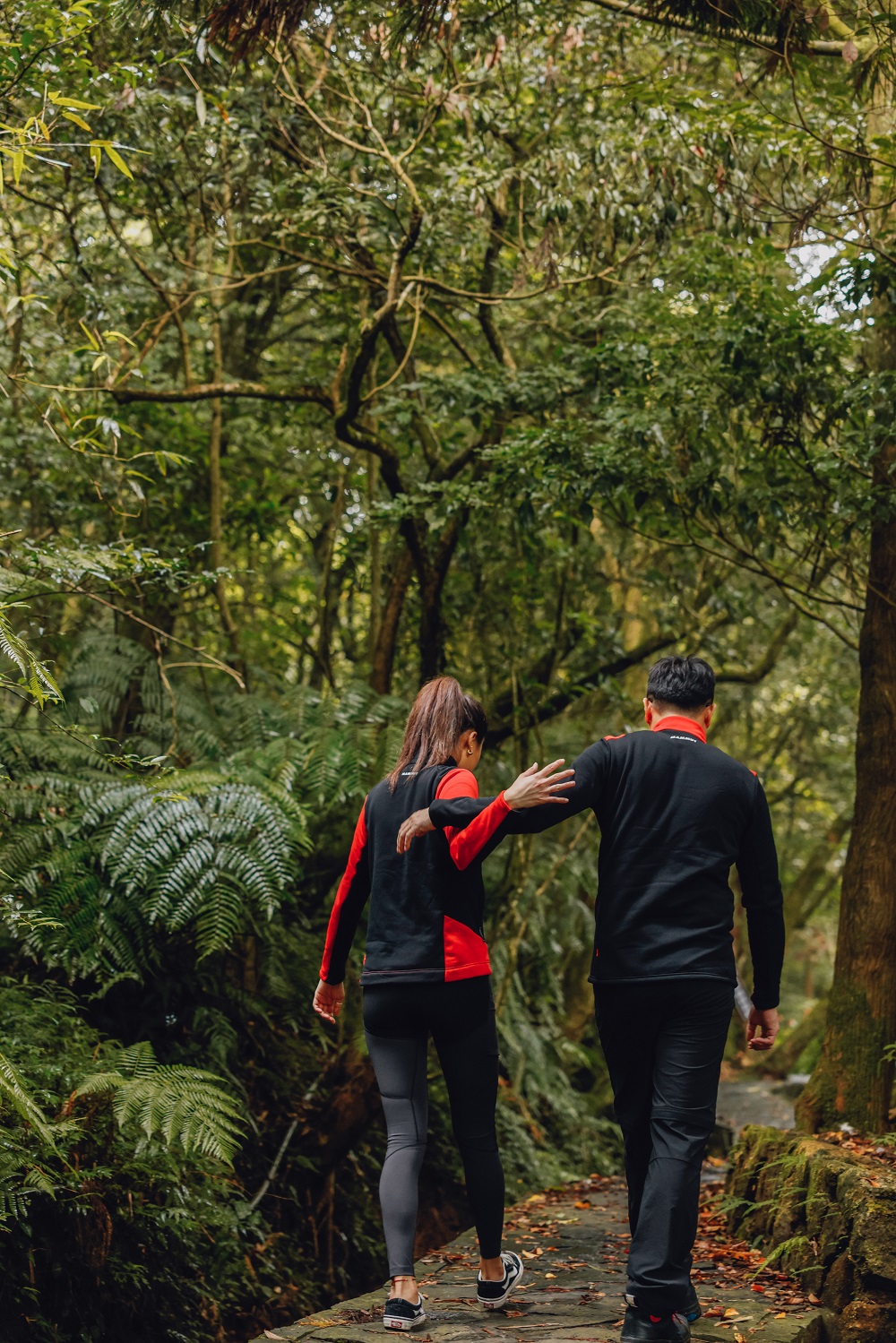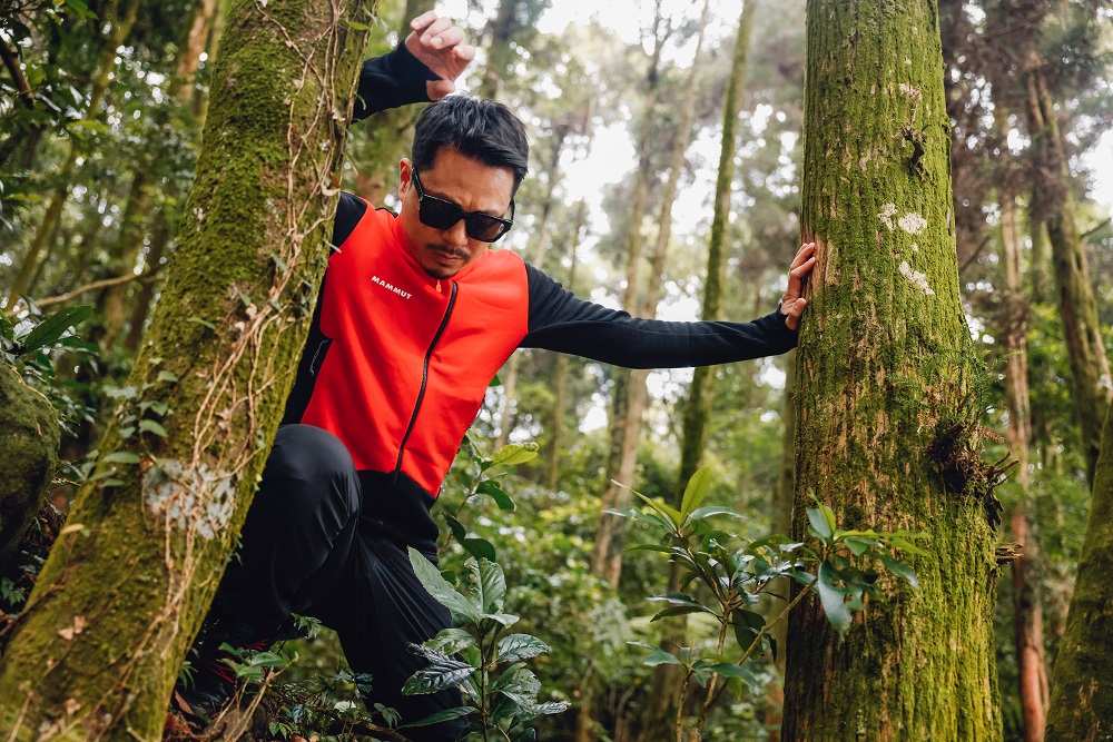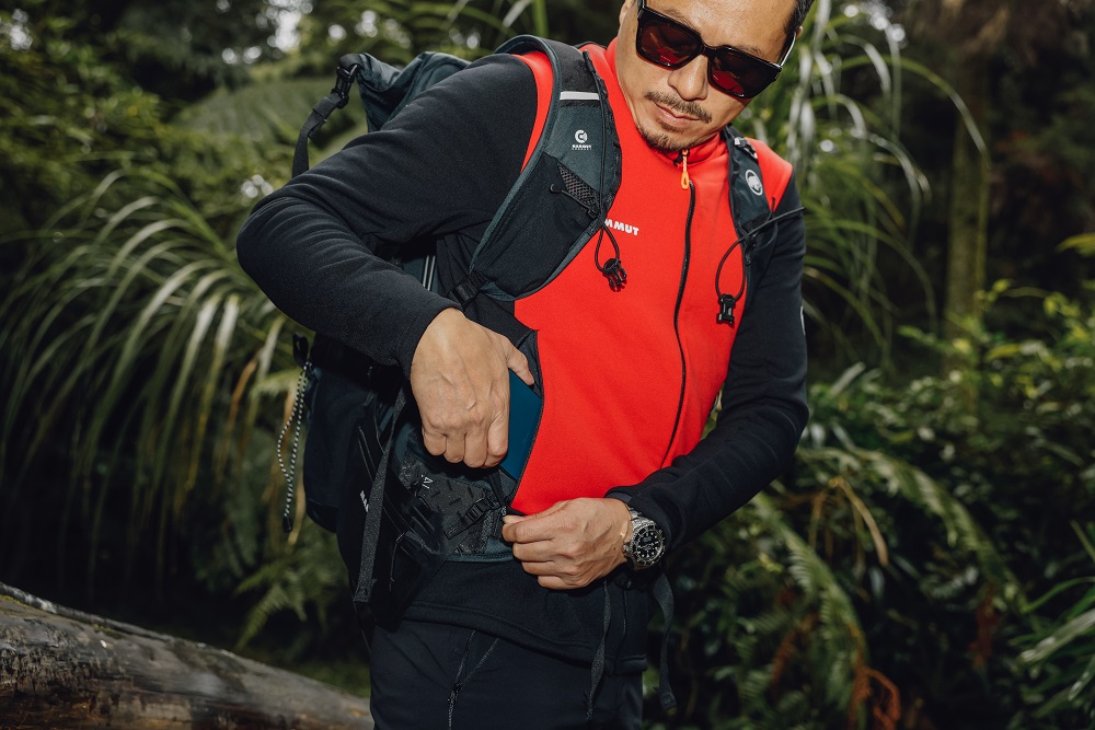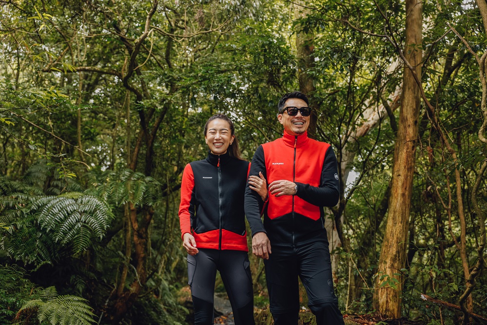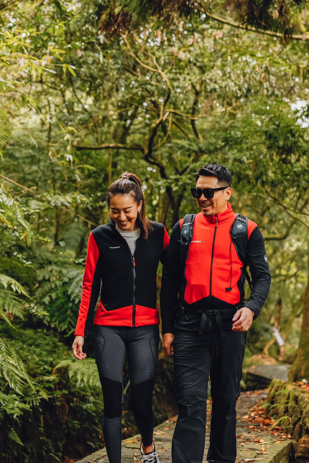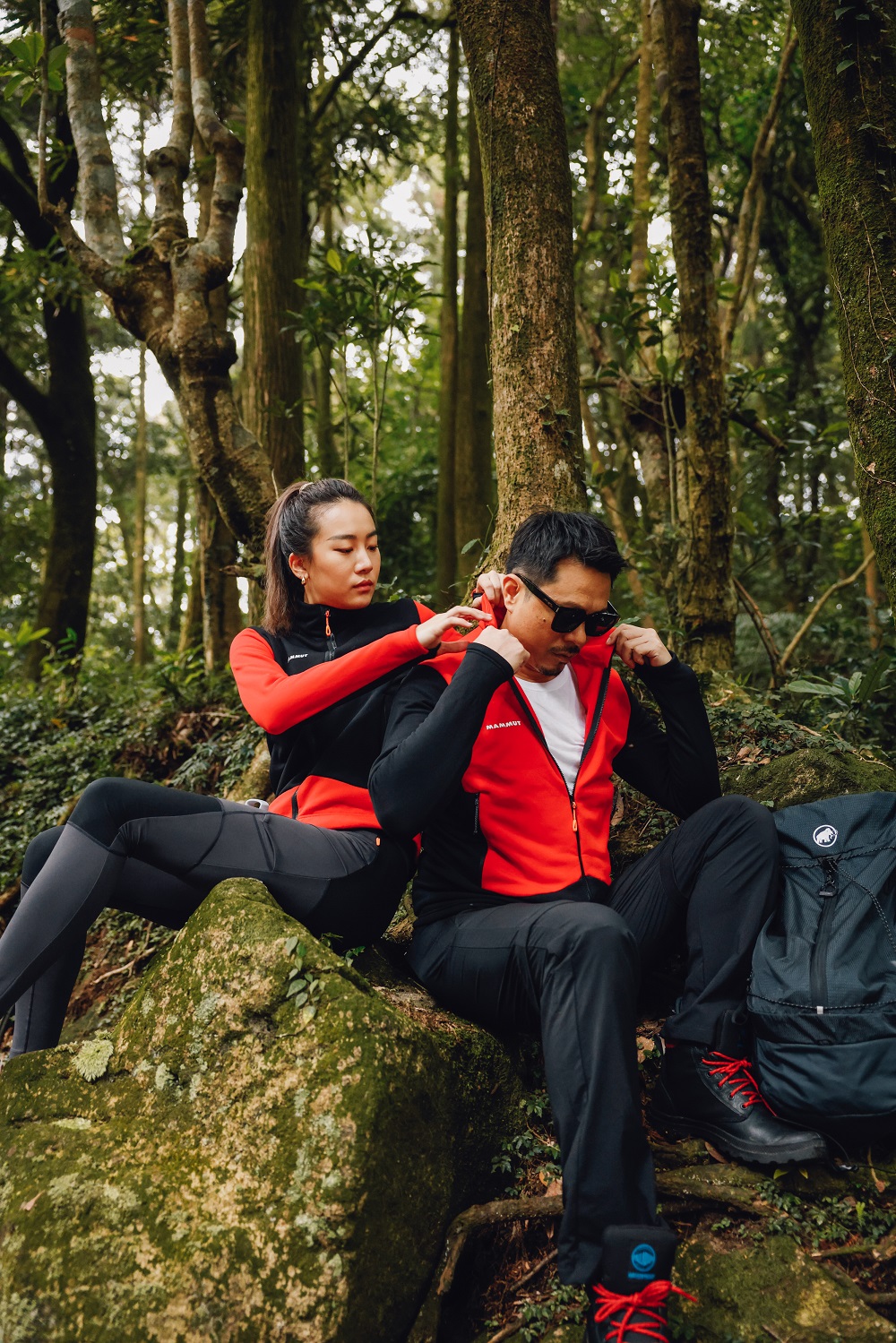 這次穿著MAMMUT 160周年紀念版的服裝,兩人第一眼看到都說「這就是我們的配色呀!」,本身就對黑紅配色情有獨鍾的Yorko,不僅品味眾所皆知,甚至擔任過日本知名訂製服品牌大使,當時也都是選擇黑紅作為搭配,稱為這就是標準的「紅水黑大方」,俐落的剪裁,Yorko笑說最近發福,想不到還有點修身效果。