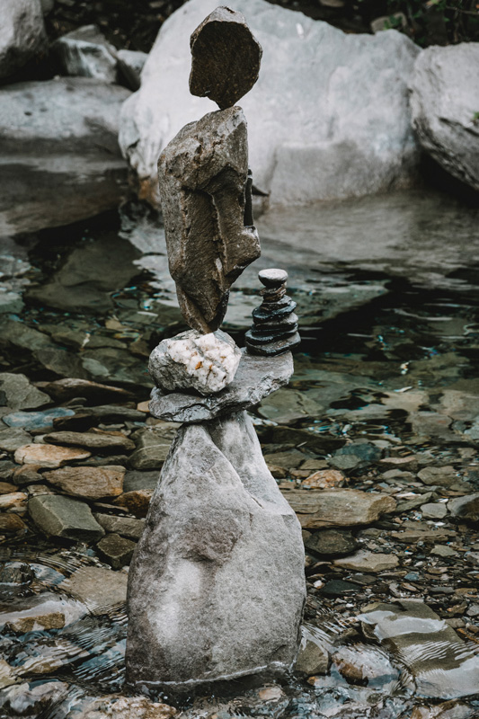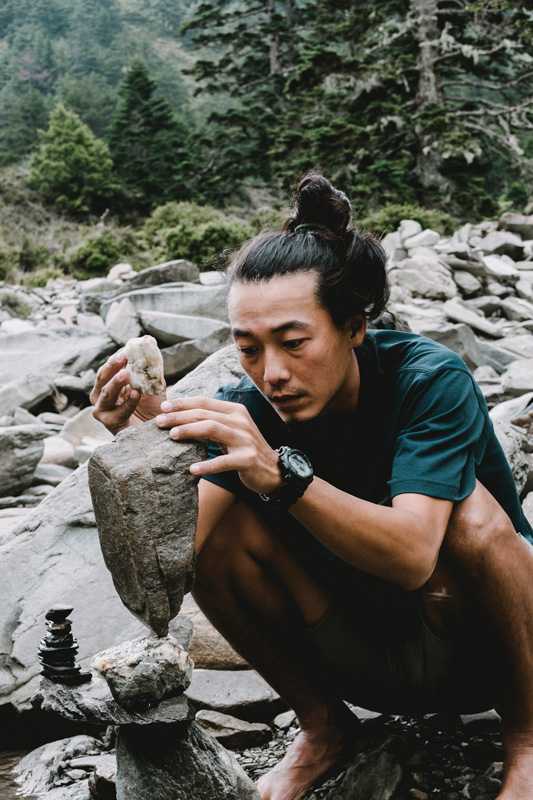 ▲大花到溪邊最喜歡做的事就是疊石頭,他說這是他在山裡最放鬆的時候。照片/邱大花