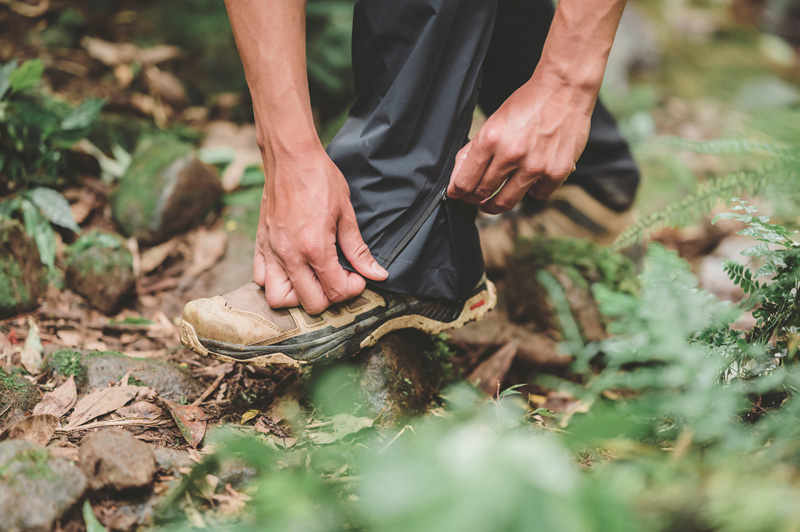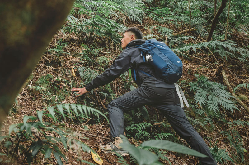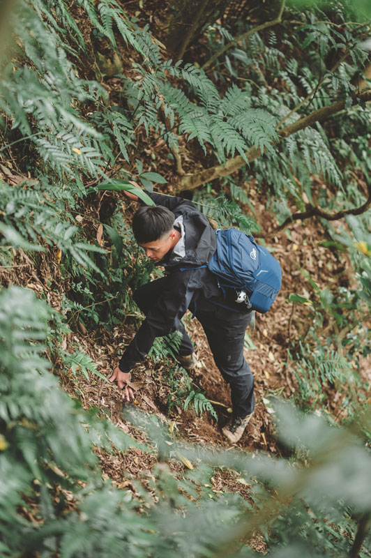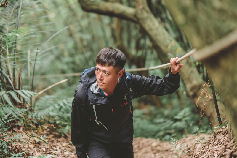 拍攝這天,普魯圖著用的是 Rab Kinetic Alpine 2.0 彈性防水軟殼外套、Rab Mantle 排汗衣、Rab Kinetic Alpine 2.0 彈性防水軟殼褲子、以及 Lowe Alpine AirZone Active 22L 背包。「在山上,防水很重要,尤其是上半身,軀幹只要有保暖,全身都會暖,所以一件好的防水外套非常重要。我今天穿的這件軟殼外套除了可以防水,也很透氣,而且最讓我驚豔的是它竟然很有彈性,不愧是設計給高級攀登者穿的。」