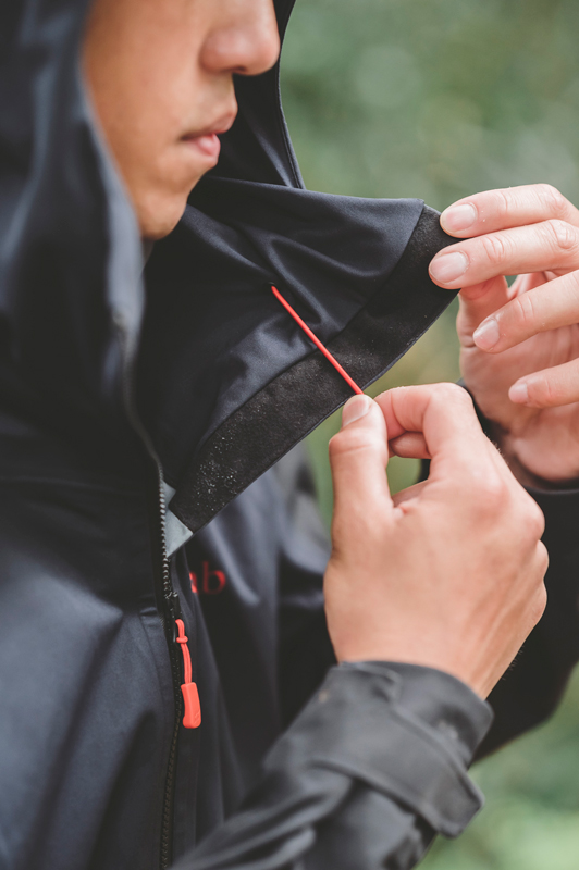 ▲Rab Kinetic Alpine 2.0 彈性防水軟殼外套在帽兜、下擺附有調節繩,可靈活調整鬆緊度。而寬大的帽兜也深獲普魯圖的心,因為戴上岩盔後寬大的帽兜還可蓋住,更確實的提供完善防水效能。(點擊圖片即可放大)