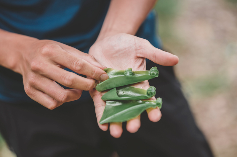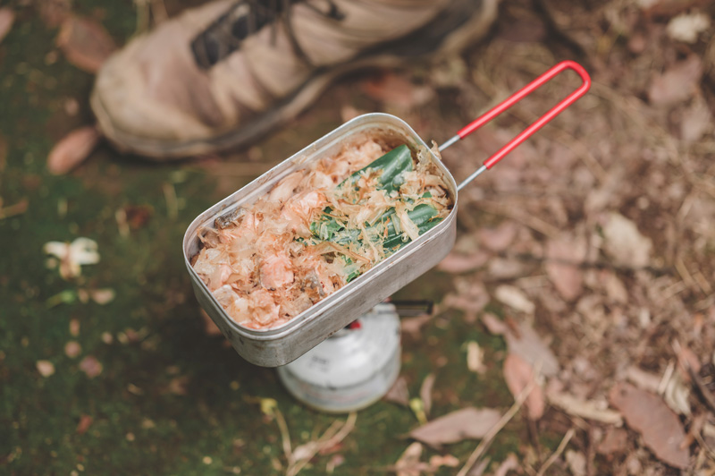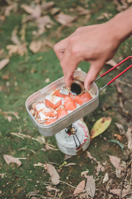 ▲隨手摘採鮮嫩山蘇,配上前一晚靈光一閃的鮭魚野菇炊飯,在林間野炊、野食,是普魯圖享受山林生活的一個儀式。