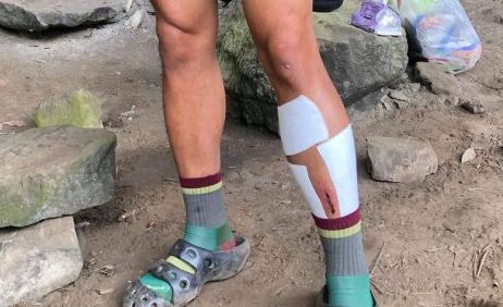 ▲摔下山崖貼紮後所攝,左腳有明顯外傷以及嚴重腫脹。
