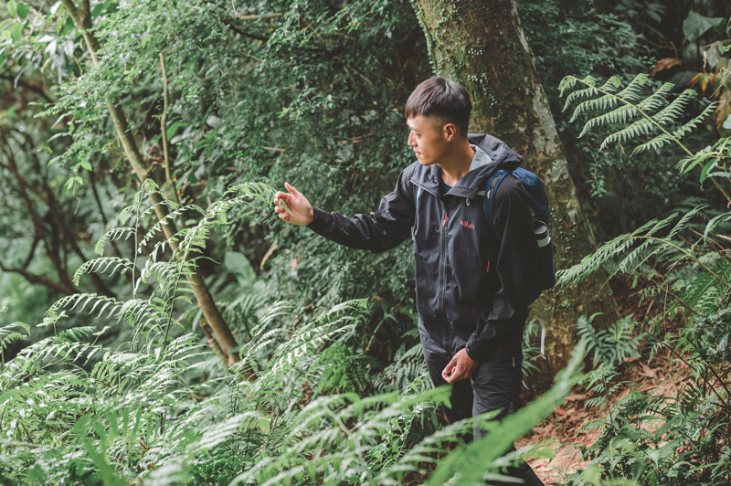▲遇到沒見過的植物,普魯圖總會停下來多看幾秒。外套: Rab Kinetic Alpine 2.0 彈性防水軟殼外套,褲子:Rab Kinetic Alpine 2.0 彈性防水軟殼褲子。