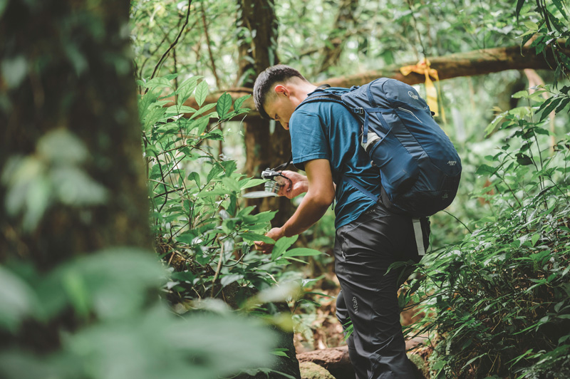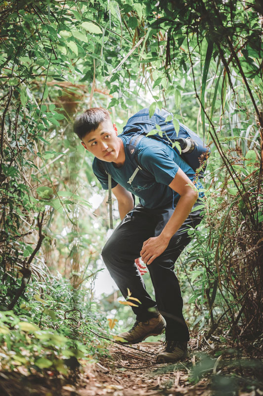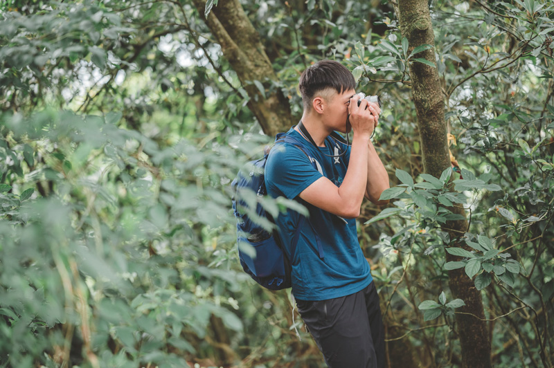 ▲不好意思笑說自己只是拍好玩的他,喜歡拿著 OLYMPUS 相機到處拍照。上衣:Rab Mantle 排汗衣,褲子:Rab Kinetic Alpine 2.0 彈性防水軟殼褲子、背包:Lowe Alpine AirZone Active 22L。