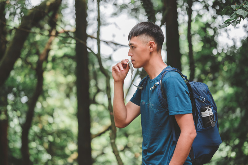 ▲若不幸走失或迷路,可以吹哨利於隊友、搜救人員辨別方位。Lowe Alpine AirZone Active 22L 背包胸扣即附有求生哨設計,聲音高頻且響亮,相當實用。