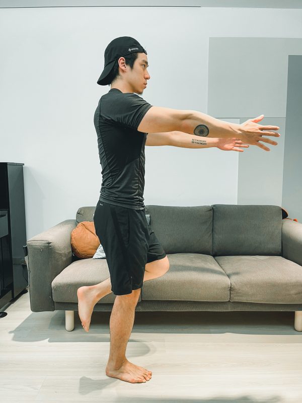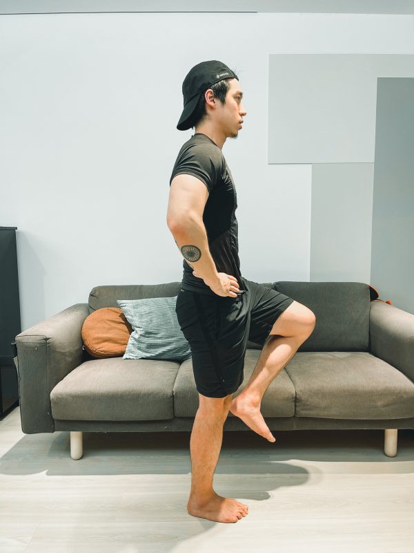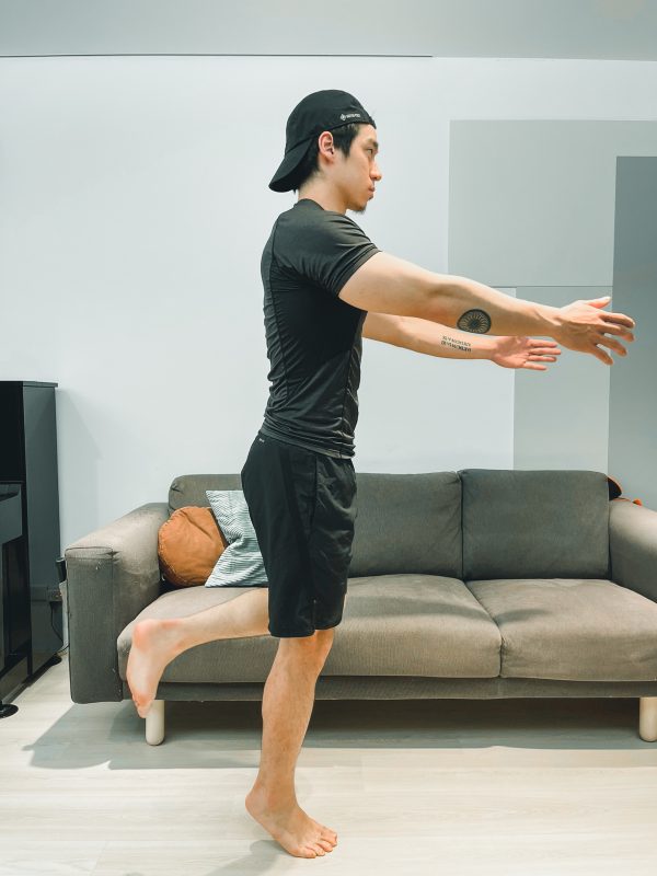 ▲動作一:雙手往前延伸或是叉腰,單側腳離地至少 2 公分。(單腳若無法站穩,可以扶著牆壁)