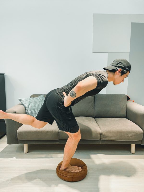▲動作一:雙手叉腰,保持軀幹穩定並將後腳懸空。