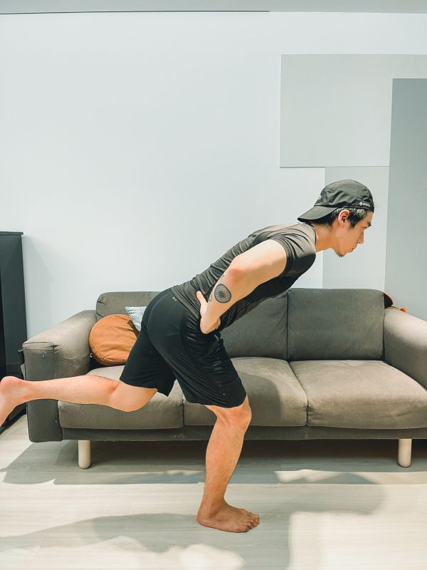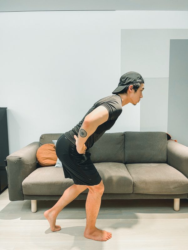 ▲動作二:維持軀幹中立,前腳微彎、上半身向前傾,以大腿後側以及臀部發力將髖部向後推。