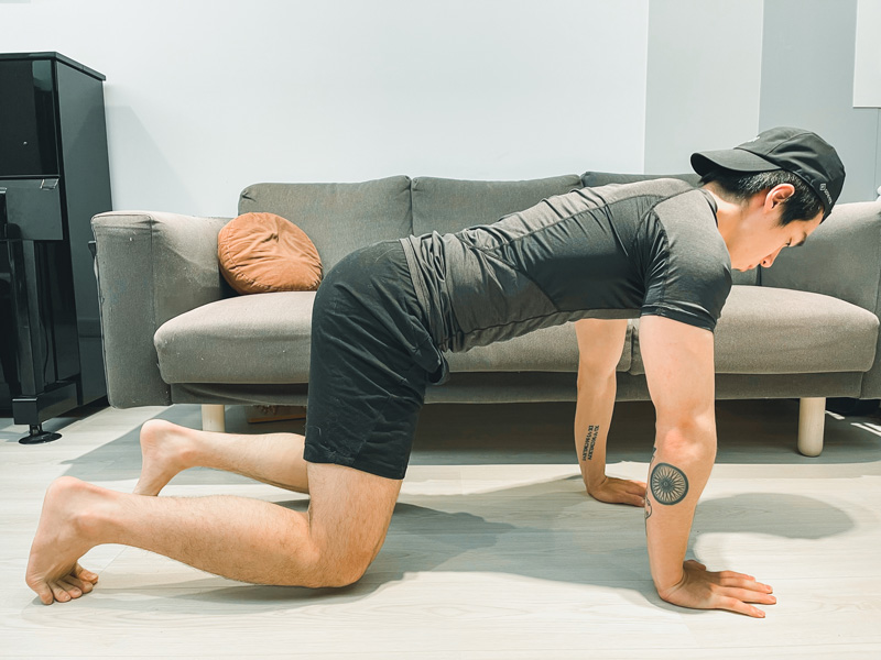 ▲動作一:四肢著地,手支撐於胸口正下方,膝蓋跪於髖部正下方,軀幹核心穩定。
