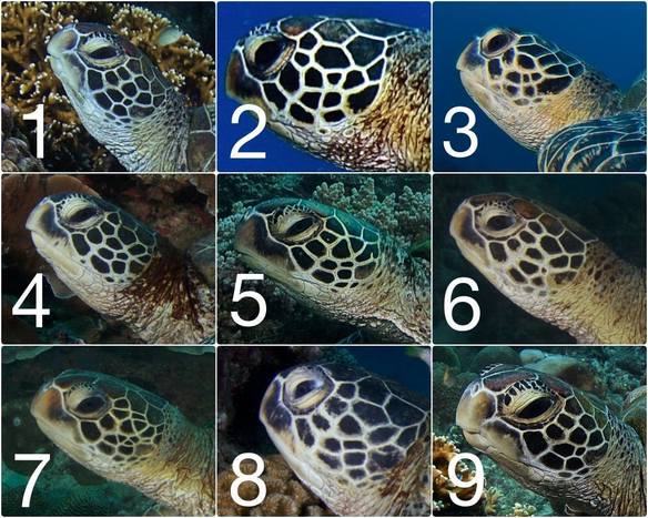 在海龜普查員項目中,透過大家回傳的海龜照片,研究人員會挑選每一種生物身體特徵部位不容易改變、但個體間又有差別之處,運用「臉部辨識法(photo ID)」,利用海龜臉部鱗片來辨識個體。認識海龜就像在交朋友一樣,需要多次的觀察,瞭解牠們的習性之外,並透過建立數據資料庫分析,也能從中找到需要改善之處,促進海洋友好行為的發展。