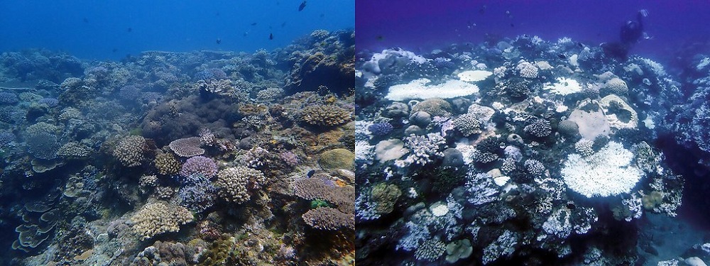 ▲墾丁合界同一潛點(非同一地點角度)在2019年11月白化前(左)與2020年9月白化後(右)的樣貌