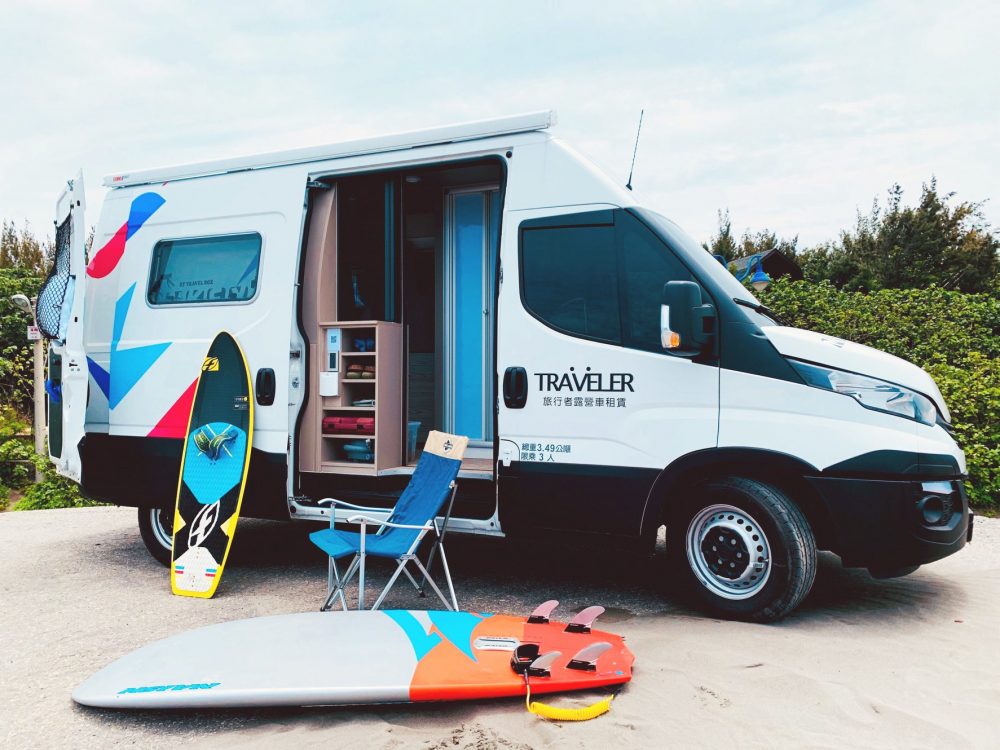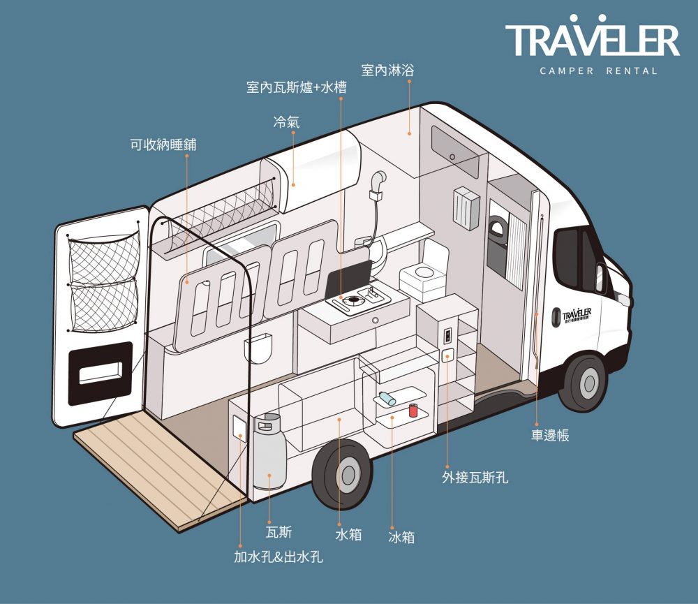 口號是「帶著家旅行」,Traveler 希望把露營車旅行的風氣帶進台灣。Traveler 採用的車款皆為義大利進口 IVECO NEW DAILY H2,內有洗手間、淋浴設備、馬桶、煤氣桶、66 公升冰箱、水管、滅火器、快接瓦斯管等配備(註:清水箱220公升 / 污水箱68公升),真的可以說是移動的家!本車的空間相當寬敞,最多可以睡到 4 個人(但不建議,會很擁擠),並有 48V 鋰鐵電池 200AH,如果一天開 6 小時冷氣,可使用 2 天,萬一沒電,也可透過 110V 外接電源充電。另外要注意的是,Traveler 的車子有可能會有品牌 logo,會介意的話可以先確認一下喔!