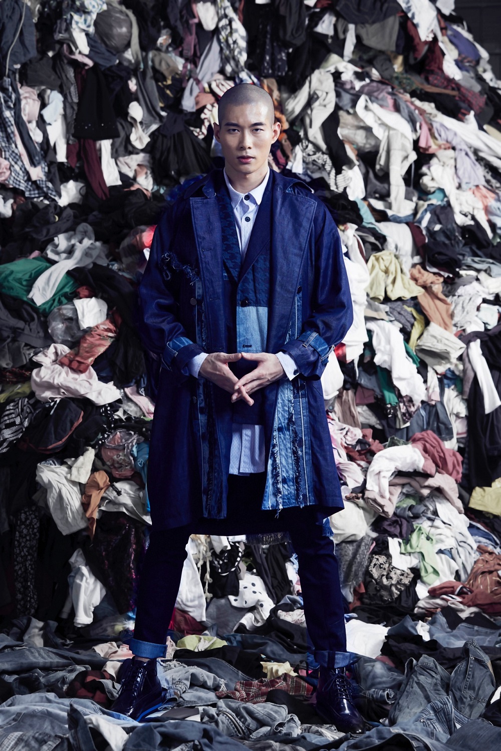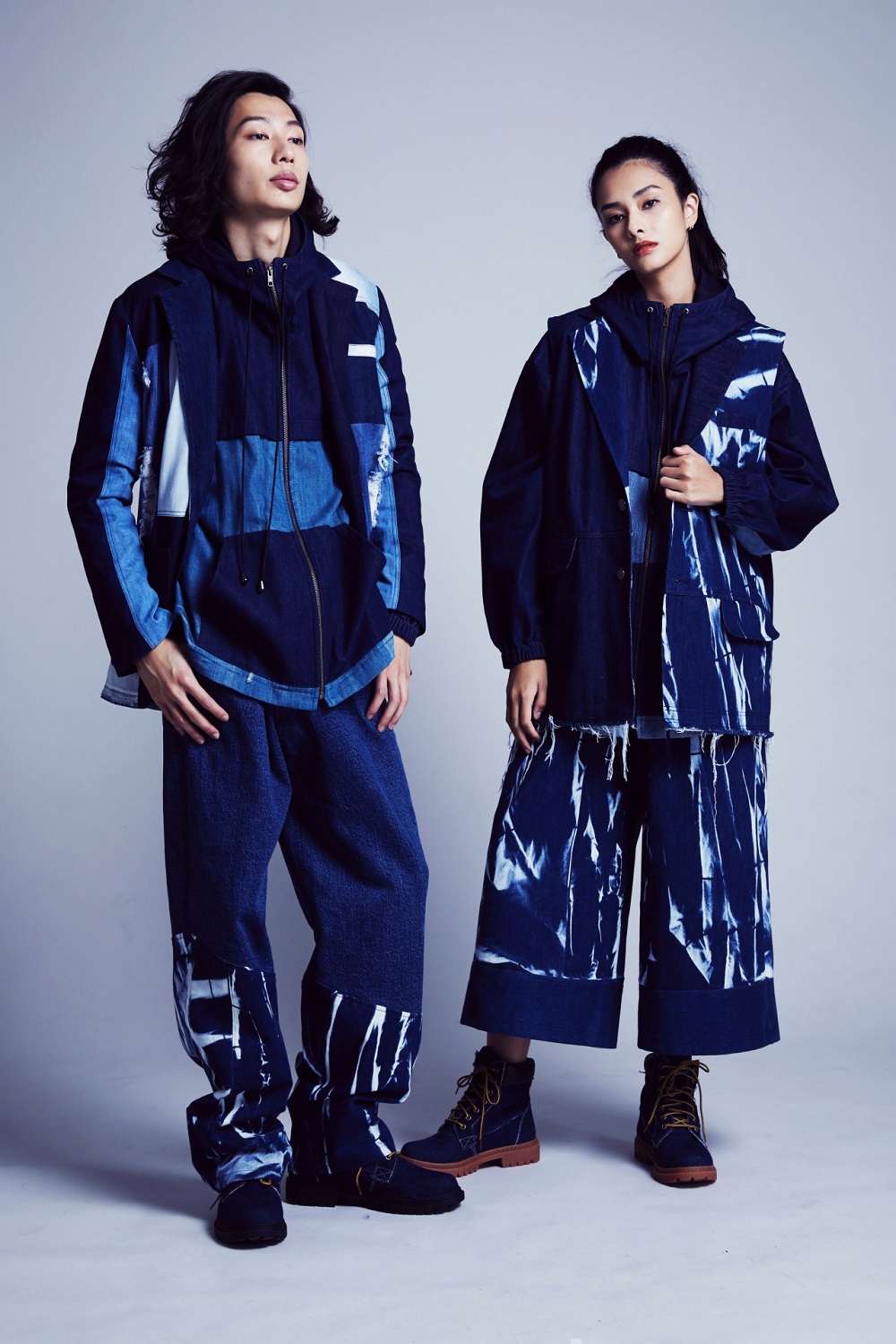 ▲時裝週走秀款-破壞拼接剪裁Kimono / 拼接不同顏色丹寧布料,採手工補丁縫製與破壞抽鬚設計。意象從消波塊與海洋、受侵襲而殘破的土地,上升到代表每個原子、每個生物終點的繁星,質問人類為何有資格恣意破壞環境。