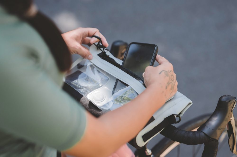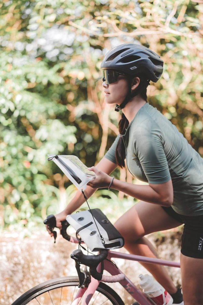 她一面看著防水觸控前袋中手機的導航畫面,一面以規律的頻率踩著踏板。這樣的畫面,每星期都可以看到至少三次。她平時會到觀音山、風櫃嘴練車,搭配 AquaSeal Active,讓她得以輕鬆的觀看手機導航或是通知。有時,她會變換方式,將 AquaSeal Active 綁上腰際,當作腰包使用。
