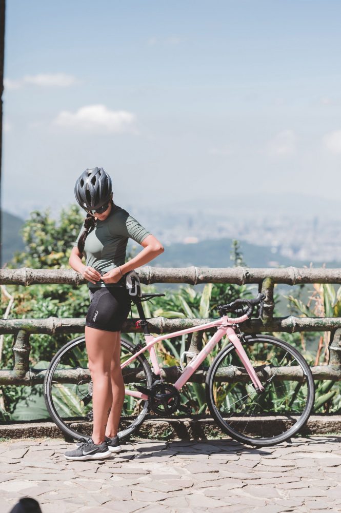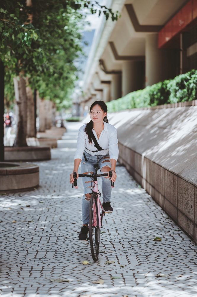 說完後,她將 bitplay AquaSeal Active 全防水跨境裝備包扣在龍頭上,接著戴上太陽眼鏡,蹬上椅墊,如流水般順暢的動作,奔馳在陽明山上。