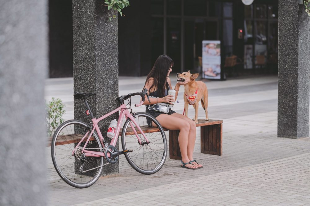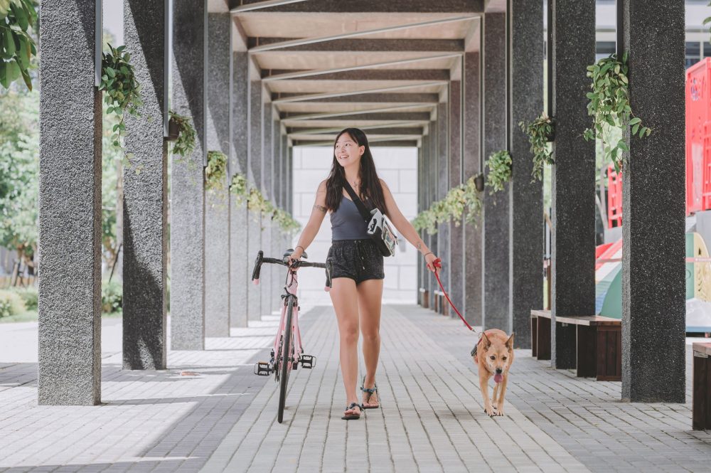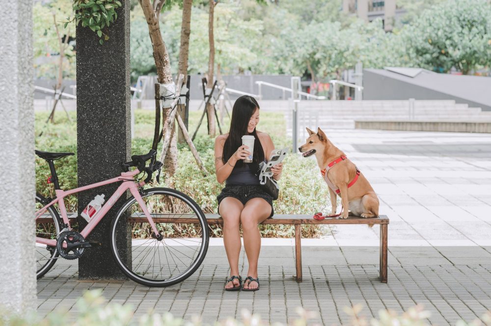 郭霏牽著一隻黃色土狗出現在我們面前,狗兒也蹦蹦跳跳興奮的跑到我腳邊聞呀聞。打聲招呼後,她從胸前揹著的包包中拿出摺疊水碗,趕緊盛了一碗水給狗兒喝,「虎克,來,喝水。」眼前這位女生,職業是獸醫,也是一名三鐵運動員,還喜歡爬山、登百岳,任何戶外相關的事,她都喜歡。「我從嬰兒時期就開始接觸戶外了,我爸媽會帶我坐上他們的吉普車,到山裡面溯溪、野營。」她一邊摸著虎克的頭一邊說。