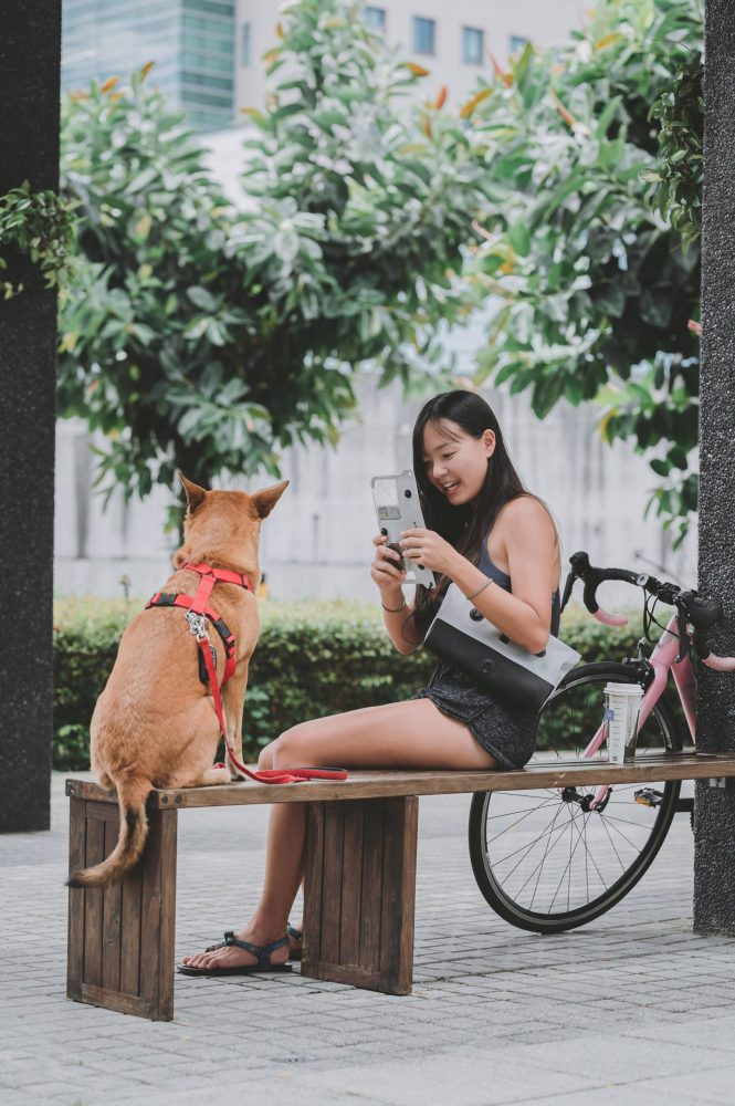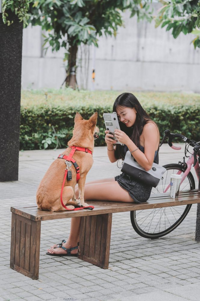 ▲日常帶虎克出門散步,換上斜肩側背方式,更方便拿取包內物品,也能隨時抽取防水觸控前袋替虎克拍下張張照片。