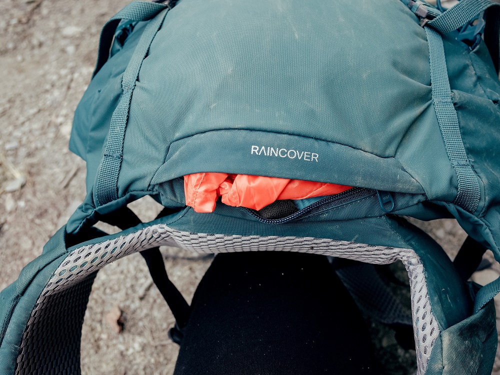 在背包底部有背包套專屬的拉鍊口袋,背包套口有彈力繩可以調整開孔大小,讓背包套更服貼,在有外掛東西時也比較容易一起包進來。