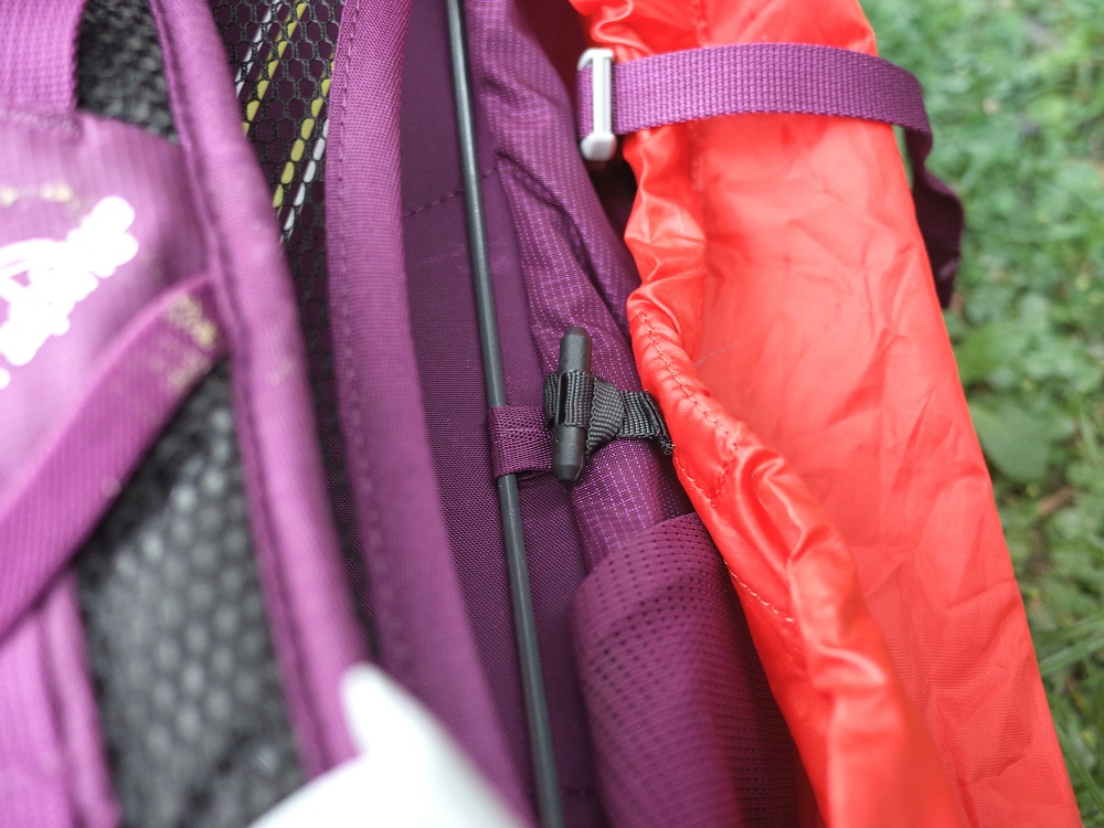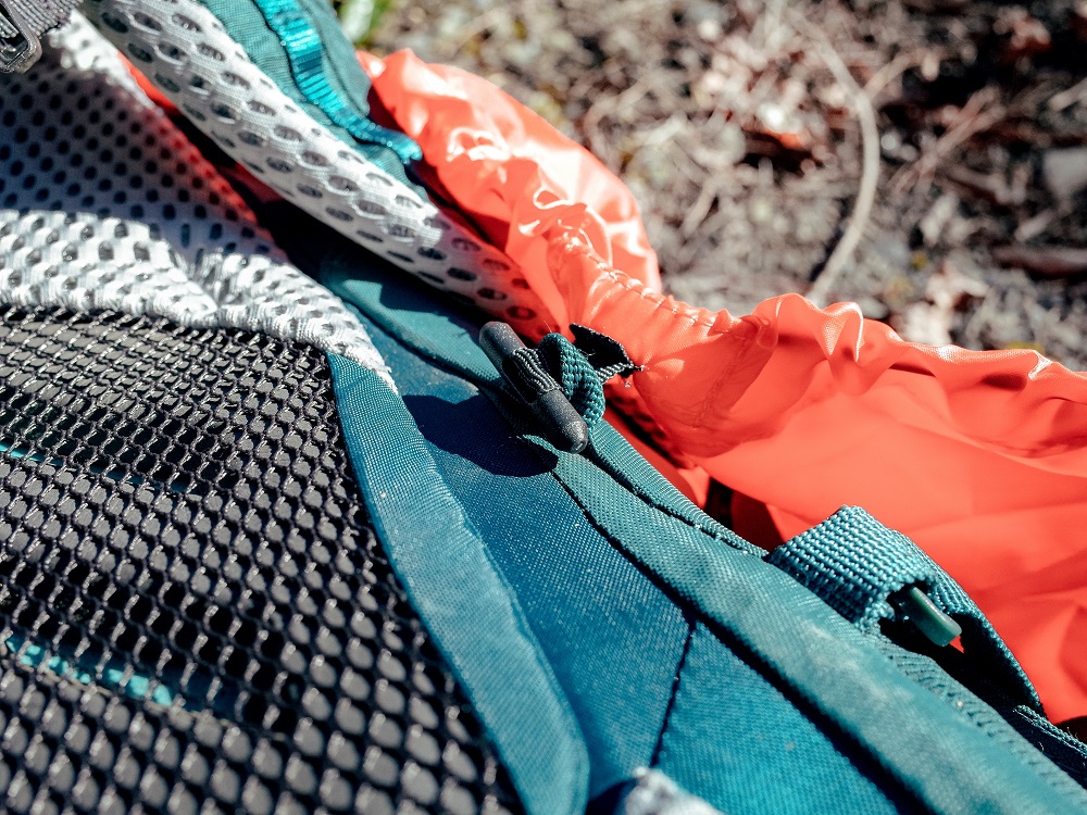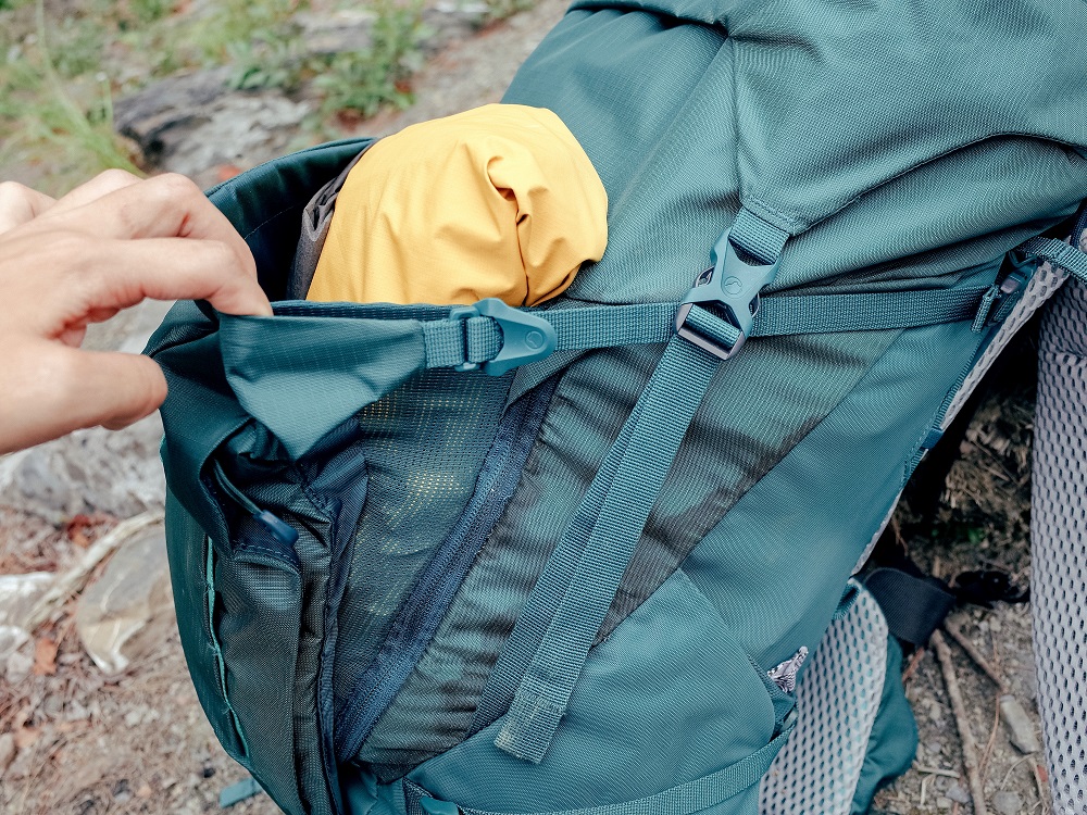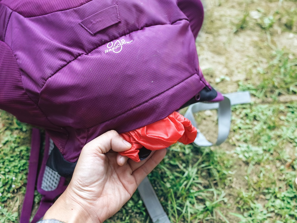 將防水背包套固定在背包上,這樣就不用常常被卡到後請別人幫忙拉背包套,靠自己就能完成,是個非常貼心的設計。