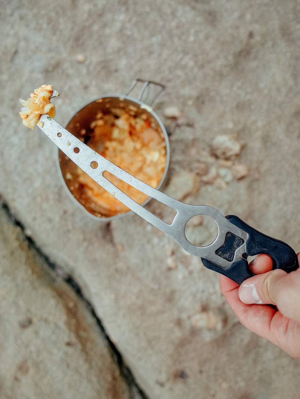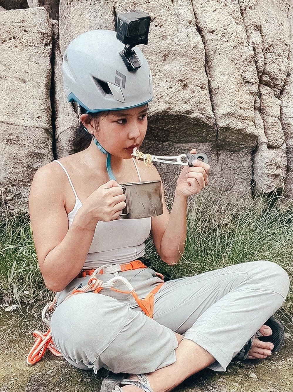 我帶了個人爐、900ml鈦杯,煮辛拉麵!解封後第一次攀岩,很有儀式感的準備豪華套餐,帶了兩顆蛋跟洋蔥,但這個天氣吃辛拉麵有點熱,鼻頭都流汗了,忘記帶餐具,用傳攀的nut tool吃!這些東西都是裝在我的Lowe Alpine_AirZone Active 18 氣流網架登山背包裡喔!