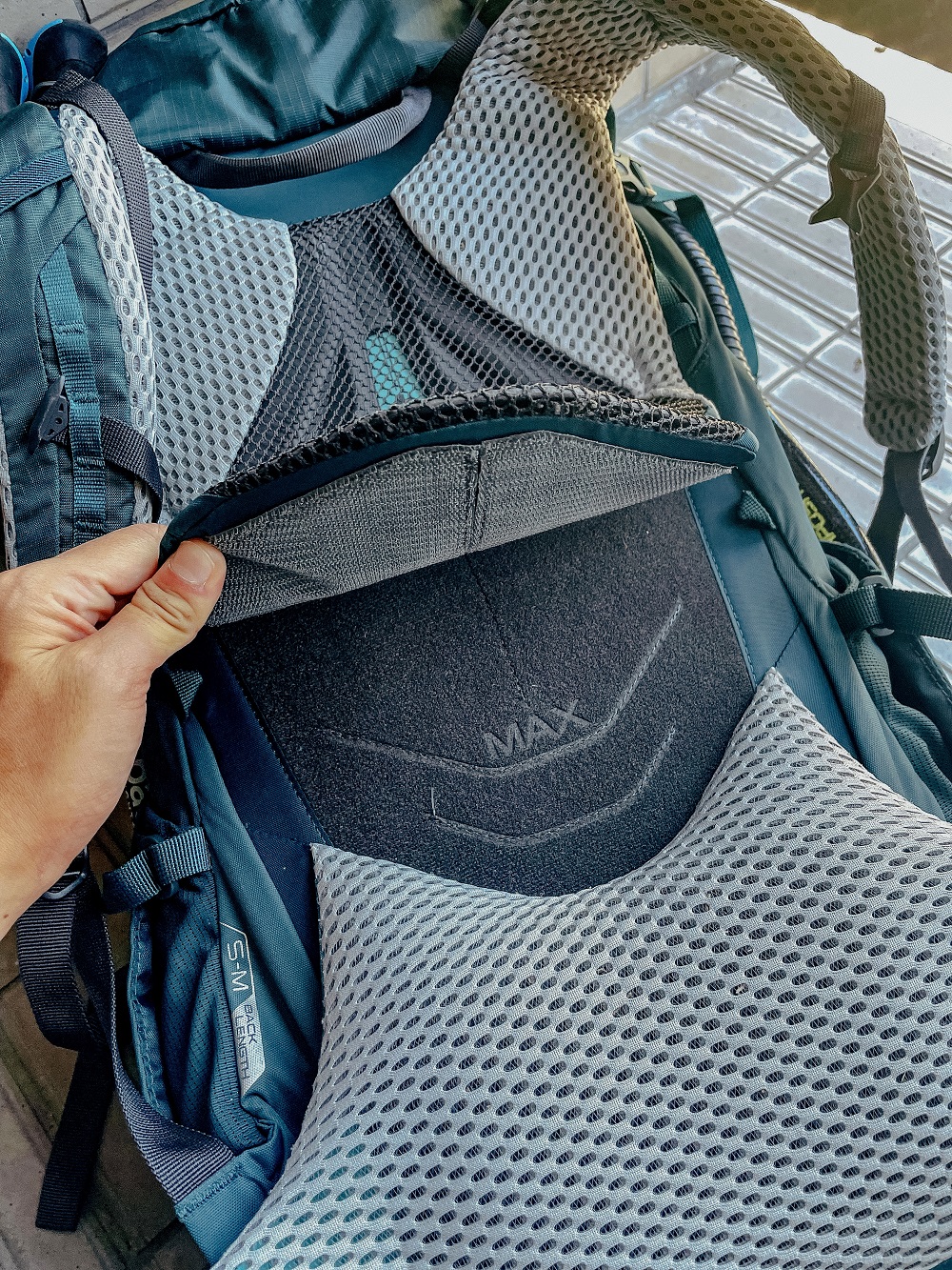 使用Lowe Alpine開發的Air Contour+背負系統,有網布覆蓋著熱壓成型的高密度泡綿背板,厚度高又透氣排汗,包覆性好,在負重下也擁有極佳的舒適感受。