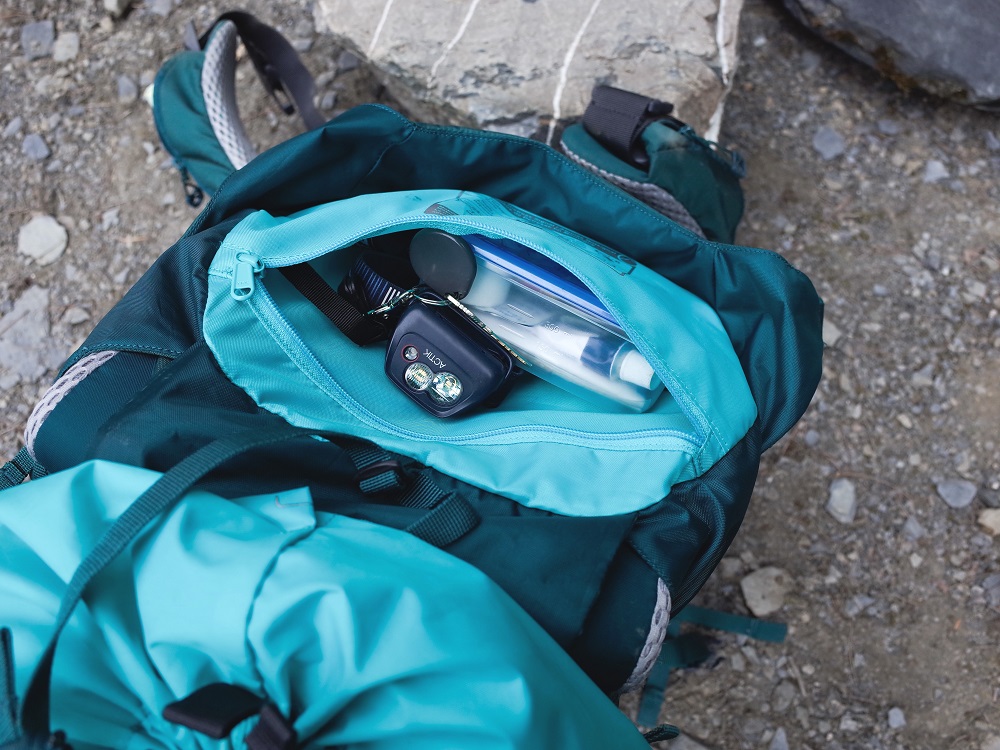 頂袋內外各兩個拉鍊袋,我通常將食物放在頂部外面的拉鍊袋,休息時食物秒拿,就算背靠在樹上還是可以輕易拿取;頂部裡面的口袋我會放需要時必須可以快速拿出來的物品,比如頭燈、醫藥箱。
