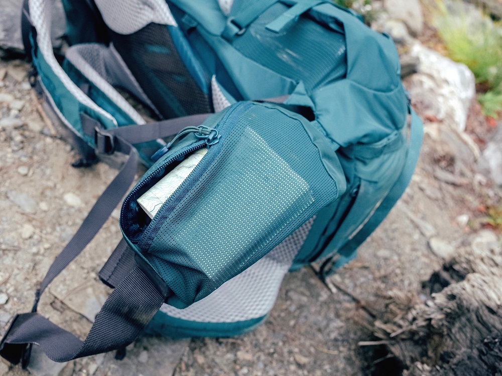 拉鍊式的U型大開口,可以輕易地拿取主袋中的裝備。主袋外還有開放式口袋與隱藏式拉鍊袋各一,開放式口袋很適合放帳篷、雨衣等濕濕的物品,隱藏式拉鍊袋可以將雜物漂亮的收起來,不用擔心放在主袋會跟其他物品壓擠。