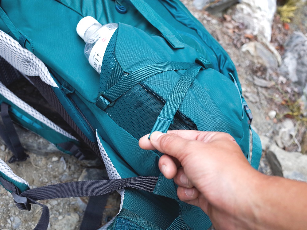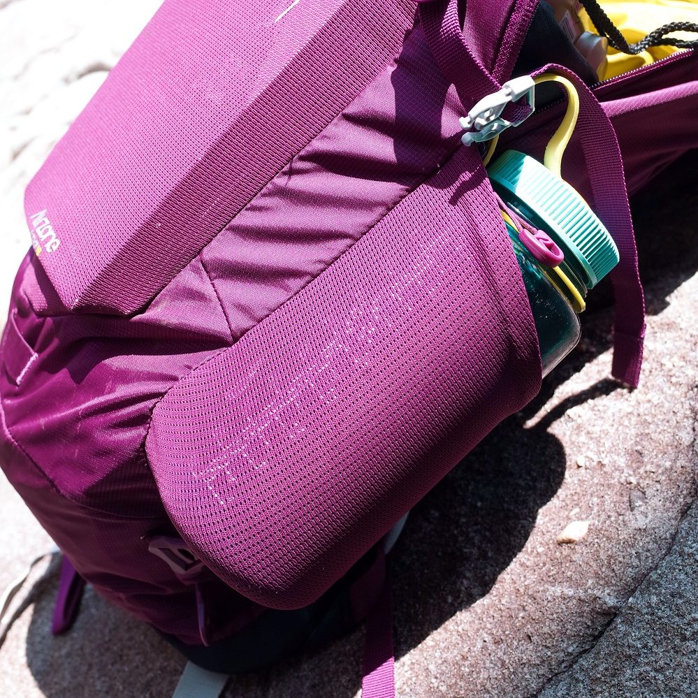 左右各一的側袋,彈力很好,而且夠深的這點很不錯,口袋太淺有時候過地形背包一彎水瓶就掉出來很討厭。除了放水瓶,塞個相機腳架也是穩穩的。