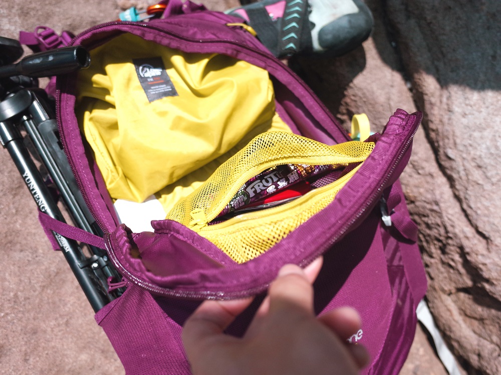 有超多收納口袋,總共有6個收納空間:主袋、主袋內網狀拉鍊袋、前方彈性開放式大口袋、上方拉鏈袋、左右各一,甚至有前方開放式大口袋!在20升以下的包包比較少見,這讓我可以把背大包的習慣完全移植過來,我習慣雨衣等可能會濕的物品放在前方空間,或放一些不想被壓到折到的東西,長湯匙、書等。