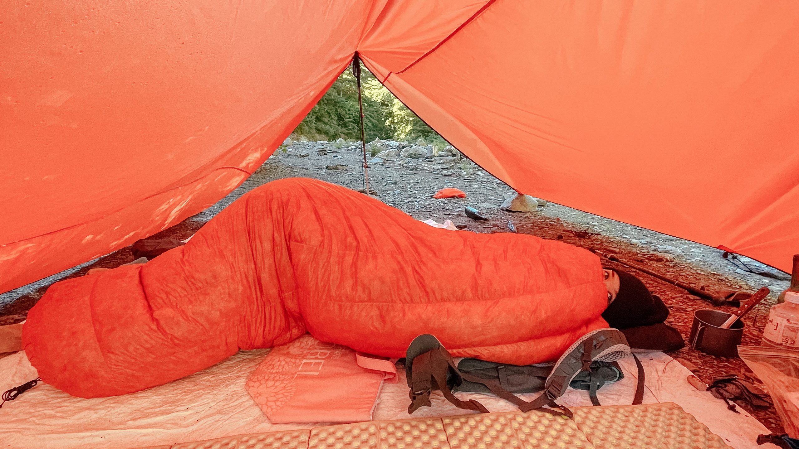 這晚發生一個小插曲,我發現我忘記帶睡墊,只好用包包與保冷袋將就,沒想到意外睡得很舒適!包包的腰墊很厚睡起來很舒服啊~