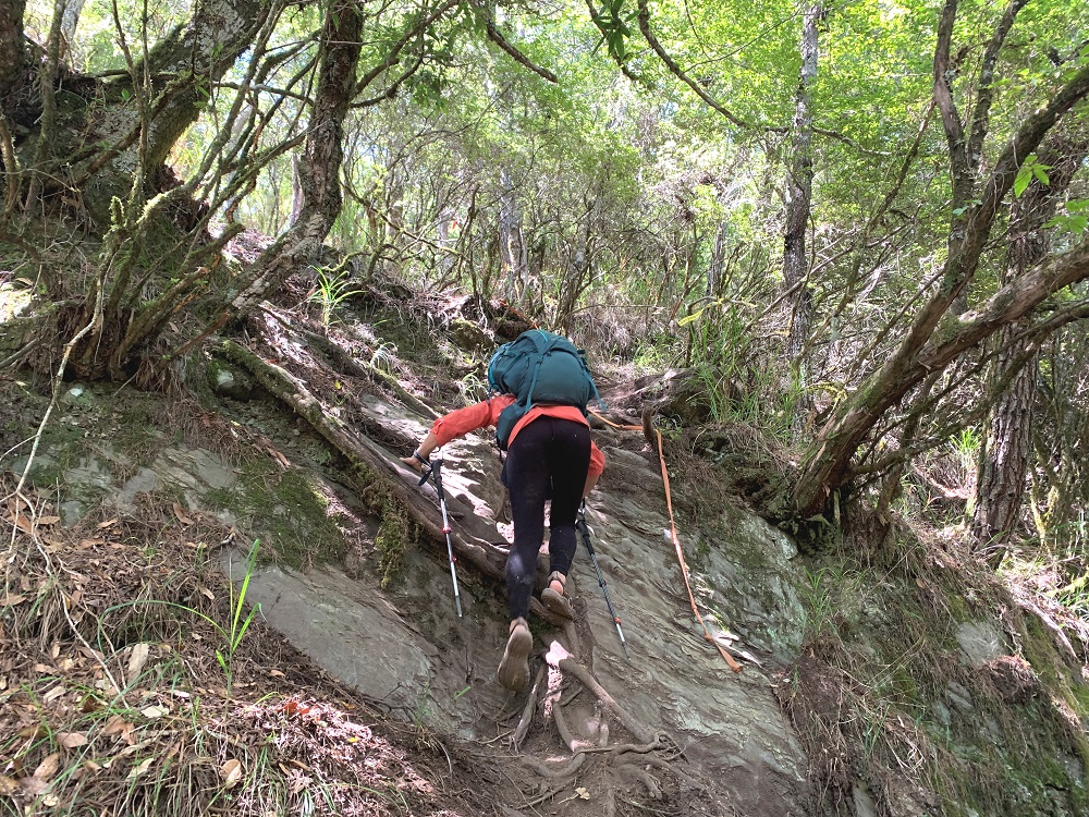 這塊裸岩地形,後面有點小崩塌,身體需要保持一點平衡,這顆穩定性很好,加上打包完後再用壓縮帶將包包收緊,整體紮紮實實,貼著身體一起移動。