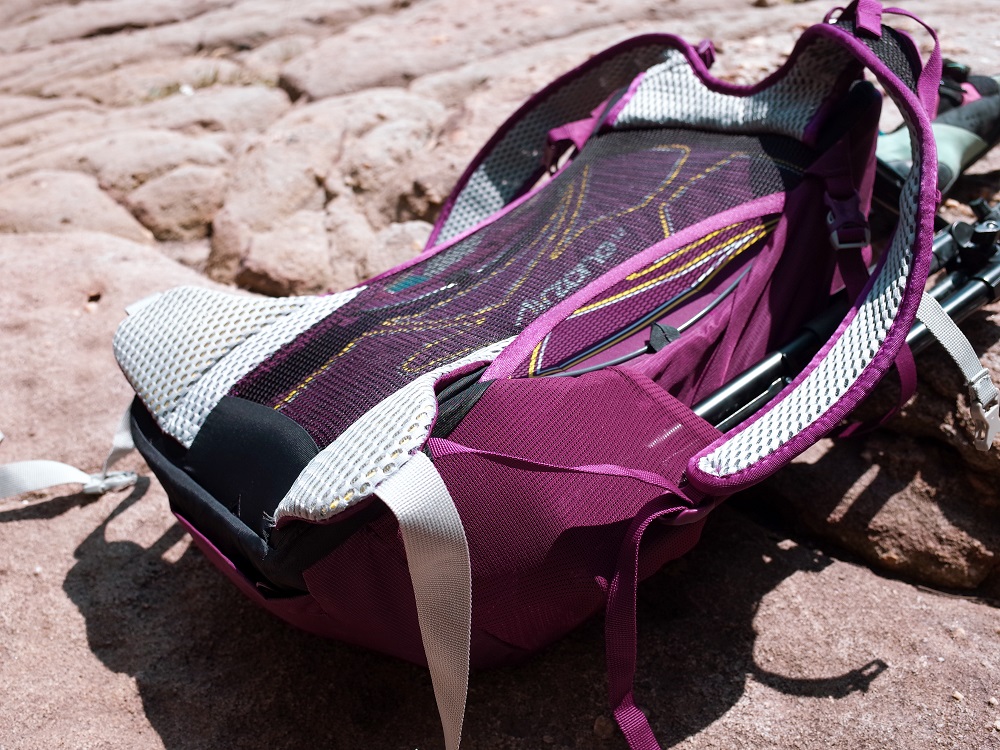 肩帶寬,而且是透氣的網狀薄墊材質,不會肩膀痛。腰部有軟墊在20升以下小背包比較少見,很多的小背包都只用腰帶繩,軟墊剛好在髖骨的位置,雖然只是小小一片但舒適性是大加分的。