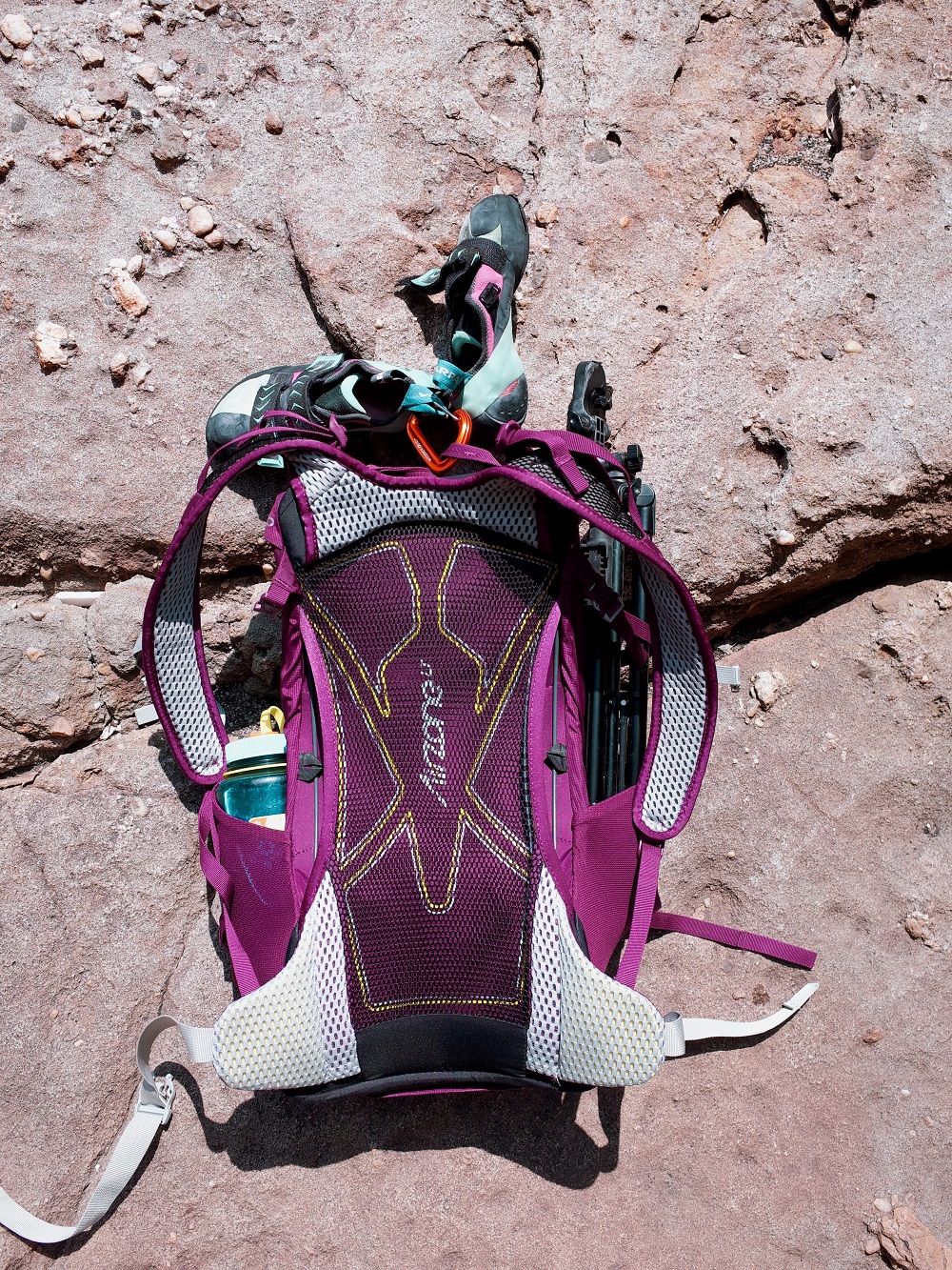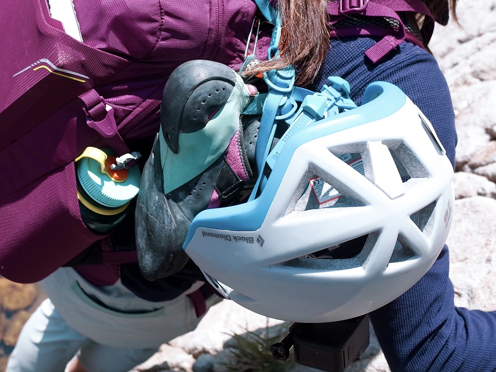 攀岩鞋跟頭盔掛在外面