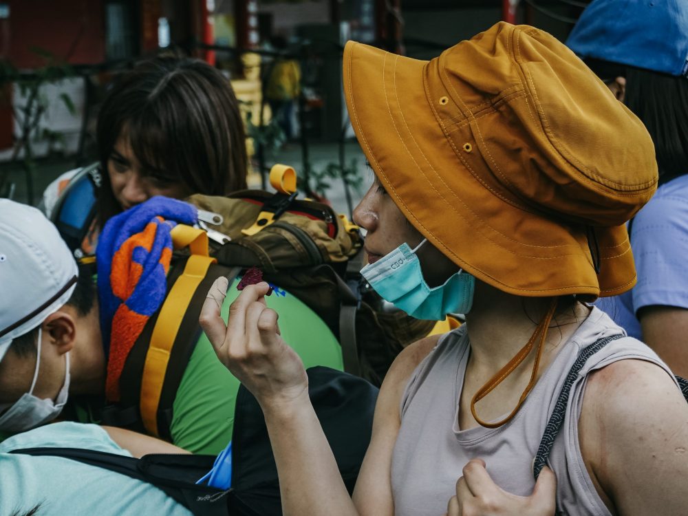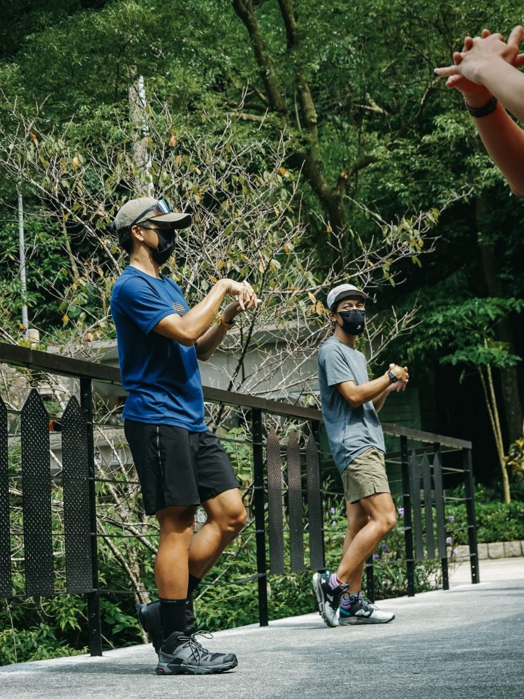 在疫情稍微趨緩之際,大家依舊謹慎的緊戴口罩。集合的現場,雖然只能看到大家的眼睛,但大家期待的心從雙眼透出的目光表露無遺。跟著 Go Formosa 嚮導歐霸還有山林老師 Lupo 的帶領,大夥先簡單做了幾個暖身動作,轉轉肩頸、動動腰椎,即起步深入山林。