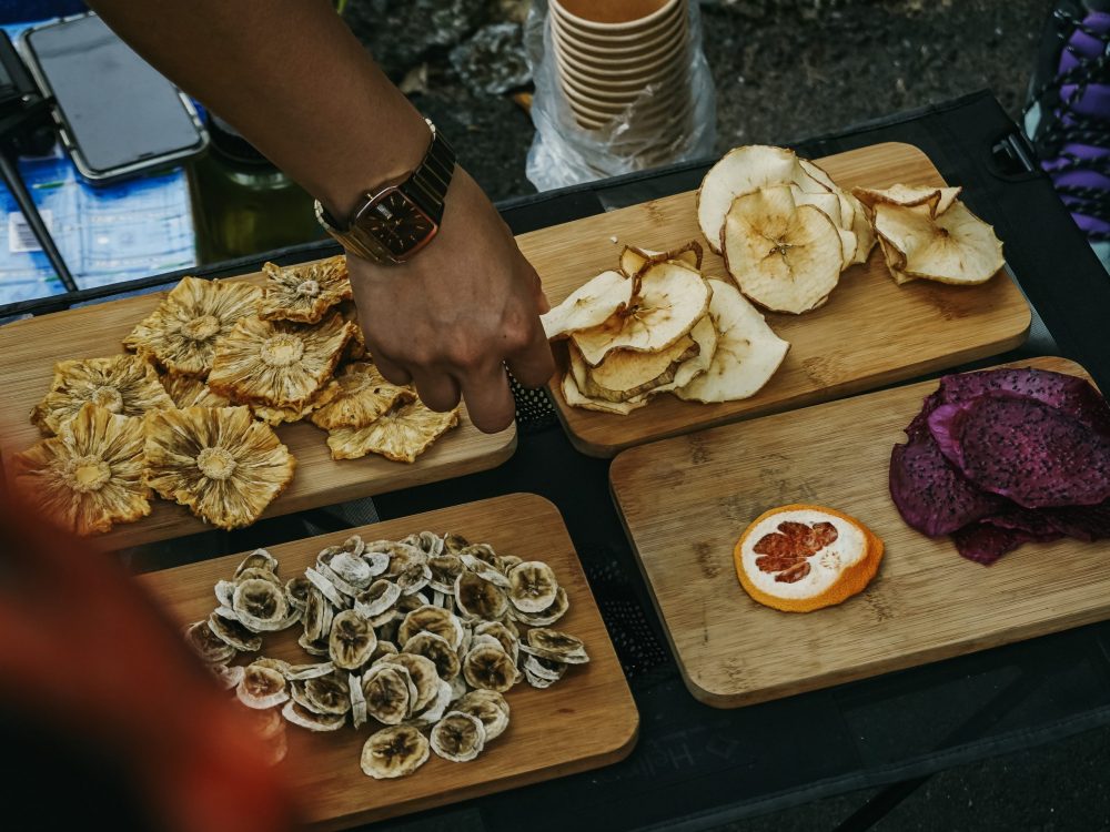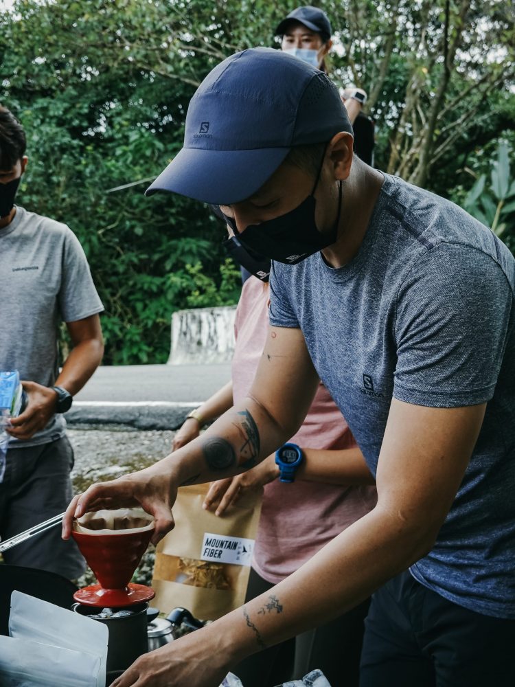 Salomon 特別邀請到知名的戶外咖啡品牌 Go Alone Together Cafe,以及果乾品牌 Mountain Fiber 山食纖維,在午餐休息處現磨咖啡,並準備了多樣的果乾款待大家。我走在隊伍中後方,抵達時已經看到許多人圍在 Go Alone Together Cafe 主理人 Alex 身旁,看他細心的手磨咖啡豆,慢條斯理的手沖,頓時間,熟悉的香氣滑進大家的鼻腔,光聞就滿足。